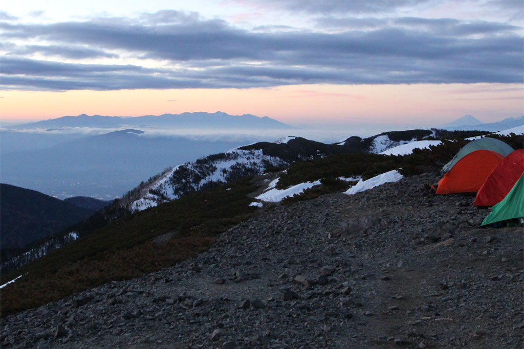 昨日の記事に、タイトルだけ書いて本文に触れるのを忘れましたが、例によってケーナとサンポーニャを持っていきました。夕方、テント場、山荘からみて山頂の向こう側で、5~6曲、ピーヒャラと吹いてきました。サンポーニャはいつも使っているカーニャ(葦)製ではなく、割れないようにプラスチック管を持っていきました。山の上でケーナは気持ちよいのですが、厳冬期ほどではないにしても、朝晩はどうしても寒くて、指も唇もなかなか自由になりません。そういえば、私のほかに、どなたかオカリナ(多分)を吹いている方もいらっしゃったようです。かすかに聞こえました。ところで、翌朝5月5日です。4時半過ぎに起き出したところ、まだ日は出ていませんでした。そこそこには寒くて、テントの周りには霜が降りていましたから氷点下ではあったのですが、厳冬期の寒さとは比べ物になりません。左に八ヶ岳、右に富士山。富士山は前日も見えたのですが、やはり日中より早朝の方が視界があるようで、よりはっきりと見えました。日の出です。テント場のテント群と常念岳、大天井岳。朝焼けに染まる槍穂高連峰。西穂高岳から前穂高岳、奥穂高岳まで。(奥穂の山頂にちょっと雲がかかってしまった)奥穂高岳、涸沢岳、北穂高岳南岳、中岳、大喰岳、槍ヶ岳乗鞍岳穂高連峰先ほどの写真より、数分か10分後くらい、少し太陽が昇ってきてからの撮影です。もう朝焼けは終わりに近い時間です。これも同様です御嶽山と乗鞍岳槍穂高連峰全部。実際は、もうちょっと明るいのですが、見た目の明るさどおりに写真を撮ると、雪の白さが飛んでしまうので、やや暗めに撮影しています。夜明けの撮影の後、お湯を沸かして朝食、テント撤収、7時過ぎに出発しました。テント場から目と鼻の先、蝶ヶ岳山頂付近から槍穂高連峰を撮影。残念ながら、山頂部に雲がかかってしまいました。この時間には、すでにかなりの人が出発済みで、テントはだいぶ少なくなっていました。それにしても、蝶ヶ岳ヒュッテ、この大きさの山小屋に二百何十人泊まったのだから、相当の混雑だったはずです。この少し先で、またケーナを吹いて、下山。動画も撮ったのですが、指が回らず失敗演奏なので、なかったことにしておきます。(笑)蝶ヶ岳に上高地側から登るコースは、徳沢からと横尾からの二つあります。登りは徳沢からだったので、下りは横尾へ、でもよかったのですが、横尾への下りは展望なく、ただただ急降下のみ。展望がないのは徳沢への下りも同じなのですが、長塀山付近は雰囲気がよいので、下りも登りと同じルートを選びました。(下った後の林道歩きが、徳沢からのほうが短い、というのもありますが)写真のあたりは、妖精の池というのがあるはずなのですが、もちろん今はまだ雪の下です。徳沢に着きました。ソフトクリームが美味しかった!!7時過ぎに蝶ヶ岳を出て、途中ケーナを吹いたりしていた時間はありますが、10時前に着いたので3時間かかりませんでした。雪の上は快調に飛ばしたのですが、雪がなくなったところからペースが落ちました。上高地まで戻ってきました。11時40分ころバスターミナル着。昼食+生ビールが美味しかった!!それにしても、2日間、ほぼ快晴ですばらしい天気に恵まれました。テントは重かったけど、やっぱりテント山行はやめられません。