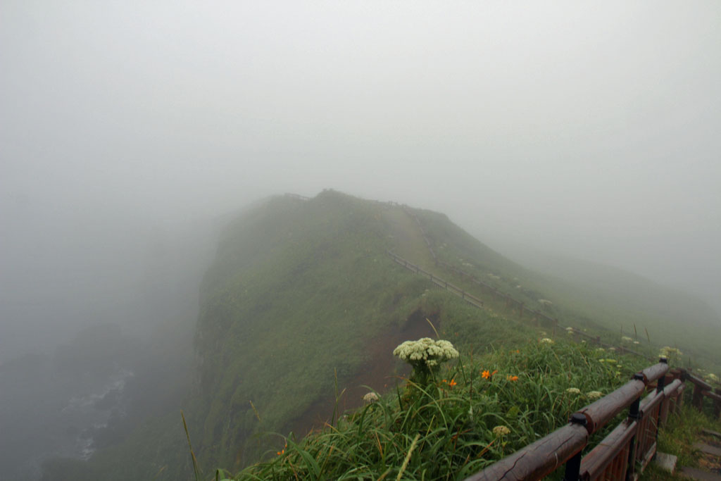 さて、北海道の旅も最終日です。この日も4時起床。しかし残念ながら天気はすでに悪く、濃霧(ほぼ霧雨)に覆われていました。それでも起き出して外出。まず霧多布岬を目指します。こんな視界なので、景色はまったく見えません。ただし・・・・・・前日の霧多布湿原よりもっとエゾカンゾウ(ニッコウキスゲ)の群落が間近に見えます。やっぱり、派手な花ですね。ほぼ岬の最先端までエゾカンゾウは咲いていました。霧多布灯台。最先端に到達。セグロカモメがお出迎えです。海とエゾカンゾウ。視界がないので、エゾカンゾウの写真ばっかり。(大好きな花ですから)エゾカンゾウのアップ。霧の中のエゾカンゾウの花畑、幻想的ではあります。で、このときも背中には笛一式を背負っておりまして、ただし露天で吹くと霧雨で笛がびしょ濡れになりそうだと思っていたところ・・・・・・屋根があった!!というわけで、ここで30分くらい笛の練習をしました。屋根はあるけど吹き抜けなので、少し濡れましたけど。で、7時頃いったん宿に戻り、朝食をいただきました。なんと、このときは少し暖房を入れたそうです。そのくらい寒かったのです。朝食は美味しかったです。夕食はないとは言え、とてもよい宿でした。宿にしばらくいましたが、待っても天気が回復する見込みもなさそうなので、とにかく出発することにしました。霧多布から釧路行きのバスは、11時半頃発、まだ時間はたっぷりあります。まずはもう一つの岬、アセチ岬へ。この日も馬がお出迎え。アゼチ岬が近付いてきました。でも、この天気ではね。早朝は霧でしたが、この時間帯はもう霧雨ではなく、ザーザー降りになっていました。中央の島の周囲にラッコが居ついているそうですが、これじゃ絶対に見つからないでしょうね。アゼチ岬の先端まで来ました。この日も歩いている人にはまったく出会わず、黙々と歩いて写真を撮っていました。晴れていれば、こんな景色なのだそうです。そんな天気のときに、来てみたかったですねえ。高台から低地の市街地へ下る道です。霧多布市街地のこの場所で釧路駅行きのバスに乗りました。いよいよ旅も終わり・・・・・・ですが、あと1回写真掲載予定です。