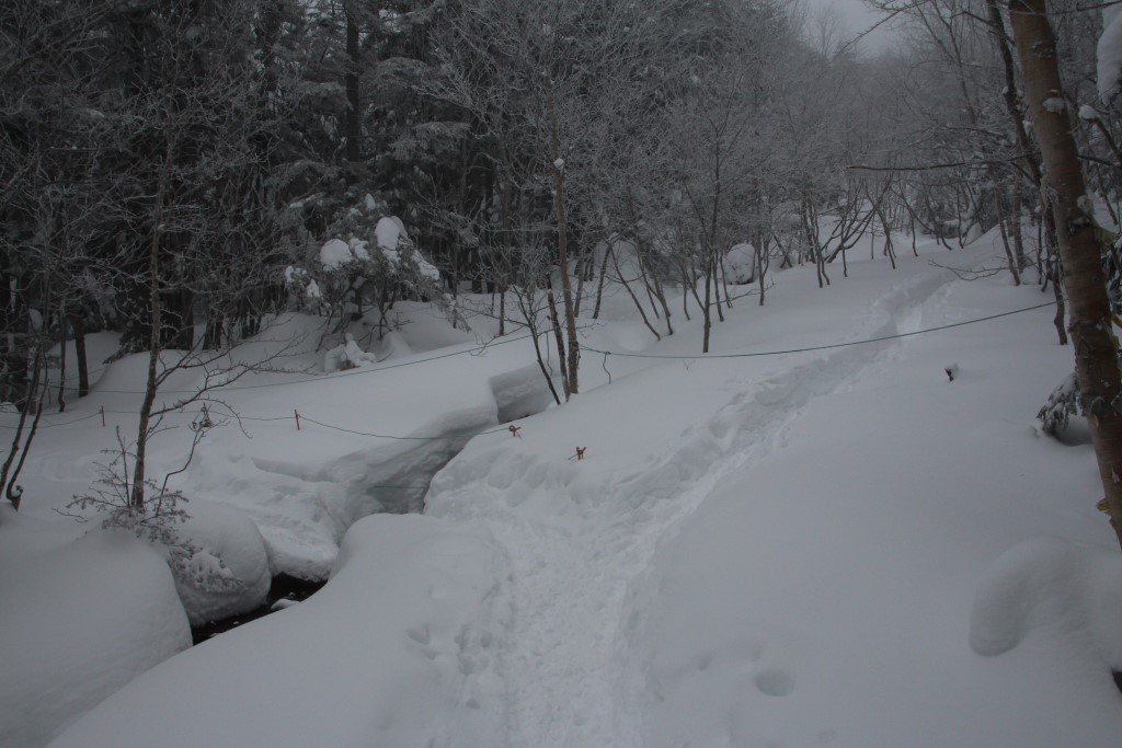 右が大同心へ、左が硫黄岳へ。亜高山帯針葉樹林の登り。降雪は激しさを増します。最悪の天気なんだけど、実は雪の樹林帯歩きって、楽しいです。未だに東京で雪が降ると、ちょっと心が躍ってしまう人間ですから。もうそろそろ森林限界に近いようです。森林限界に出た!暴風雪だ!!稜線に出ました。赤岩の頭。視界なし。一人だったら、ここで確実に引き返していました。ここに出るまで、樹林帯の登山道はほとんど一人だったのですが、稜線上には何人か登山者がいました。年末なので、入山者は多いのです。向こうにもう一つ指導標が見え、登山者もいるから、あそこまで行ってみよう。というわけで、次の指導標に到着。先ほどの指導標から、ほんの20mか30mですけど。そうしたら・・・・その先にケルンが見えたので、そこまで行ってみました。さらにその先に行くという人が4~5人いたので、私もその先へ。一人だったらこの先は行っていないでしょうが、岩場が見えてきました。実は先ほどの赤岩の頭から硫黄岳山頂までって、登山地図の標準コースタイムで20分です。目と鼻の先。でも・・・・・・このまま硫黄岳まで行けるかな、と思った次の瞬間、また一層激しい暴風雪。さっきのケルンが一瞬見えなくなりました。その瞬間即時撤退。帰る際の目標物が見えなくなったら厳しいですから。かろうじて見えているうちに、一目散にケルンまで引き返して、下山しました。やっぱり樹林帯の降雪は楽しいけど稜線上の降雪は怖い。下山中。降雪はさらに激しさを増しています。私の後からも何人か登山者が登ってきており、私の前にここを登山者が通過したのはおそらく15分か、どんなに長くても30分前だと思いますが、もうトレースが埋まり始めています。赤岳鉱泉に帰ってきました。吹雪の中でも氷壁を登る人たち。(を脇目に見ながら、私はインスタントみそ汁を飲んでいました)昨日より一段と積雪が増しています。この間もどんどん雪が降っています。生クリームがおいしそうです。林道の終点まで戻ってきました。雪が降ったので、車のわだちで圧雪されてツルツルだった林道が、フカフカ雪になって歩きやすくなってました。前回紹介した、八ヶ岳で一番の難所「やまのこ村」脇の斜面も、わだちの跡を避けてフカフカ雪を踏めば何の問題もなく通過できました。これならアイゼンが欲しいと思うこともなし、です。で、美濃戸口まで下山して、八ヶ岳山荘近くで第2回笛タイム→小屋で入浴→帰宅降雪の山登りもそれはそれで楽しいけど、次はやっぱり晴れた登山がいいなあ。