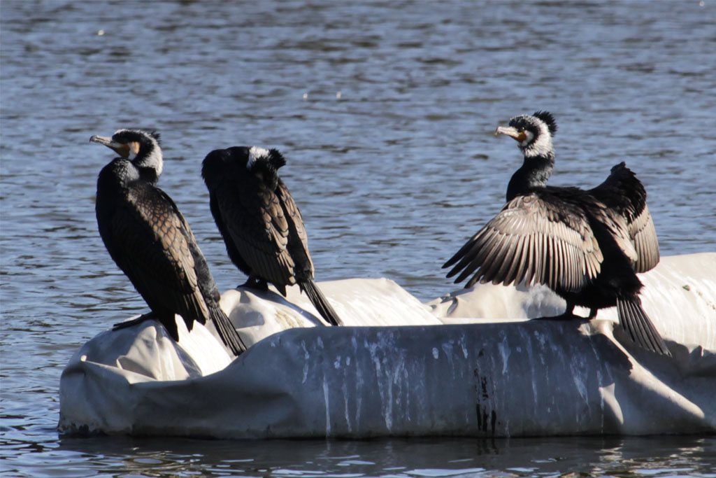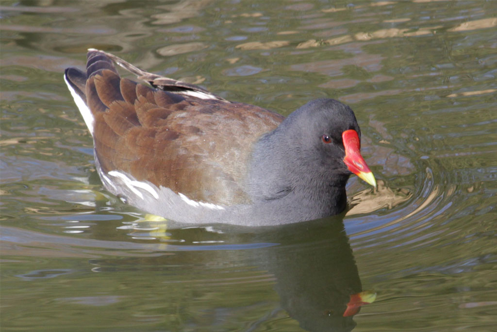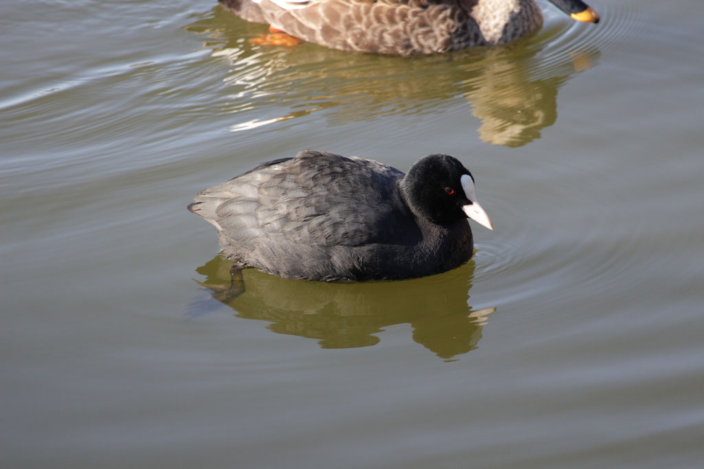 これもまた、カモに間違えられやすい鳥ですが、オオバンです。カモではなくクイナの仲間(ツル目クイナ科)です。足に水かきがない(指が少し扁平になっている)ので、前に進む効率が悪いせいか、首をひょこひょこ前後に振りながら泳ぎます。
