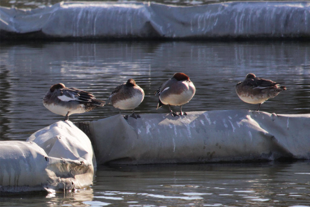 皆さんお昼寝中で、頭を羽根の中に隠しているので分かりにくいですが、ヒドリガモです。