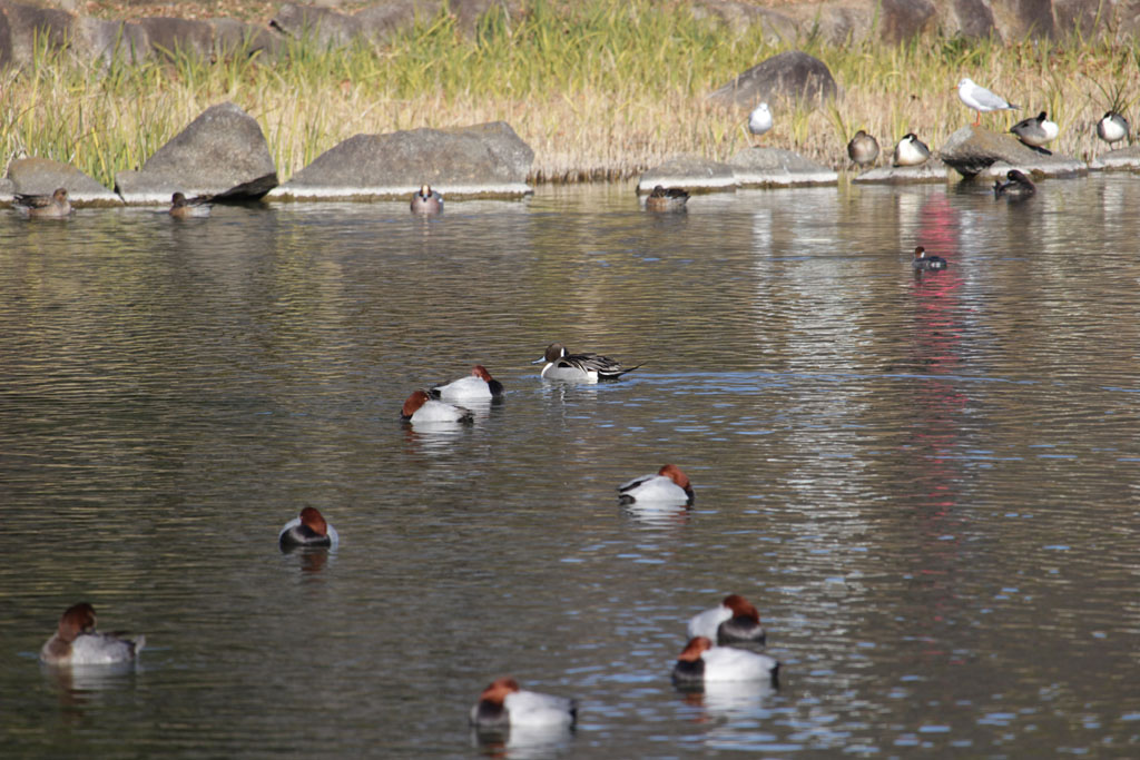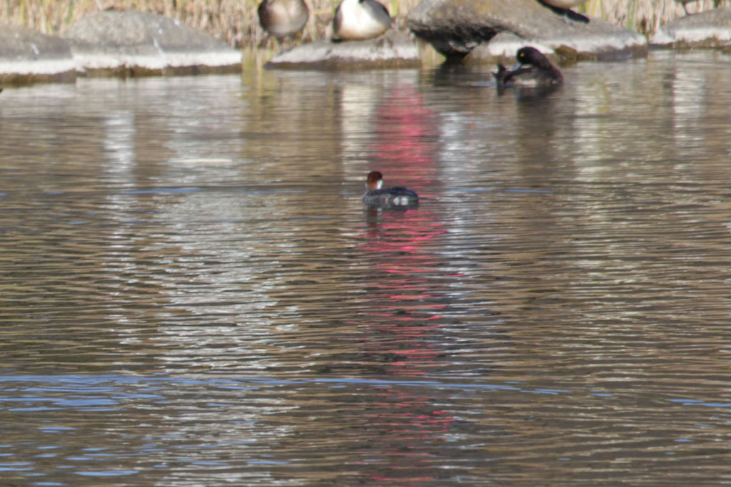 確かに、駅から通りを渡ってすぐ、カモの群れがいました。ホシハジロ(頭が茶色のカモ)とキンクロハジロです。