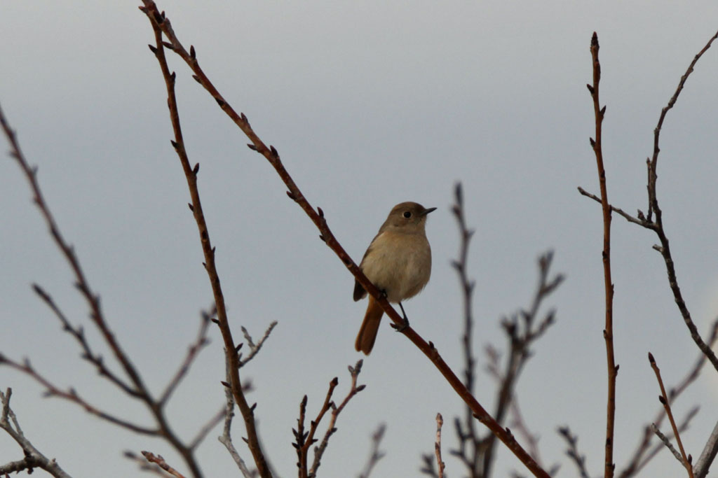 おジョウさん現れる。ジョウビタキのメスです。冬鳥の小鳥としてはかなりメジャーで、都市部でも稀ではありません。私も、子どもの頃、そして大人になってからも何回か見ているのですが、野鳥観察を再開してからは、何故か遭遇できず、写真は今回が初めてです。本当は、オスの方が派手な色ですが、オスは見当たりませんでした。