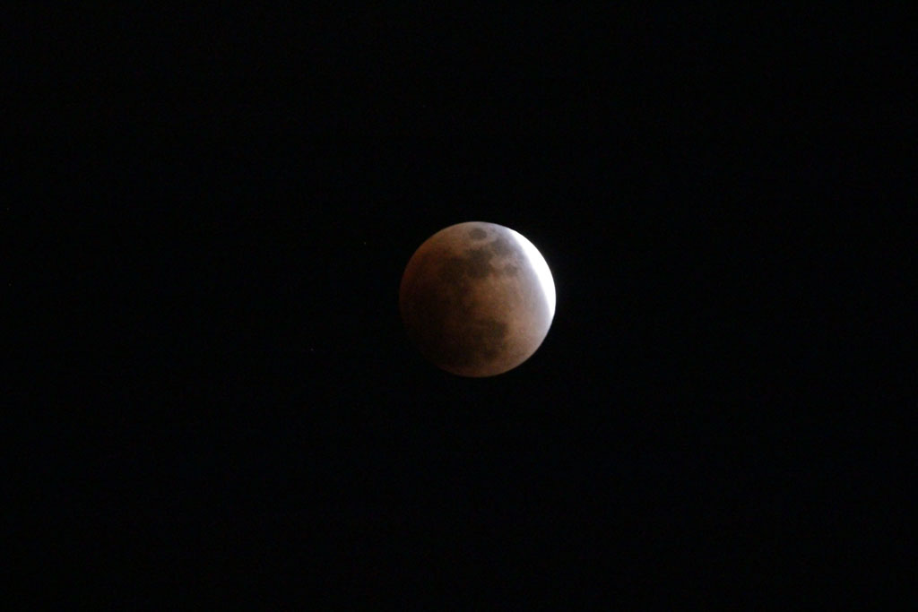 皆既月食直前。しかし、この辺りから暗くてオートフォーカスが効きにくくなり、ピンボケ写真を量産。