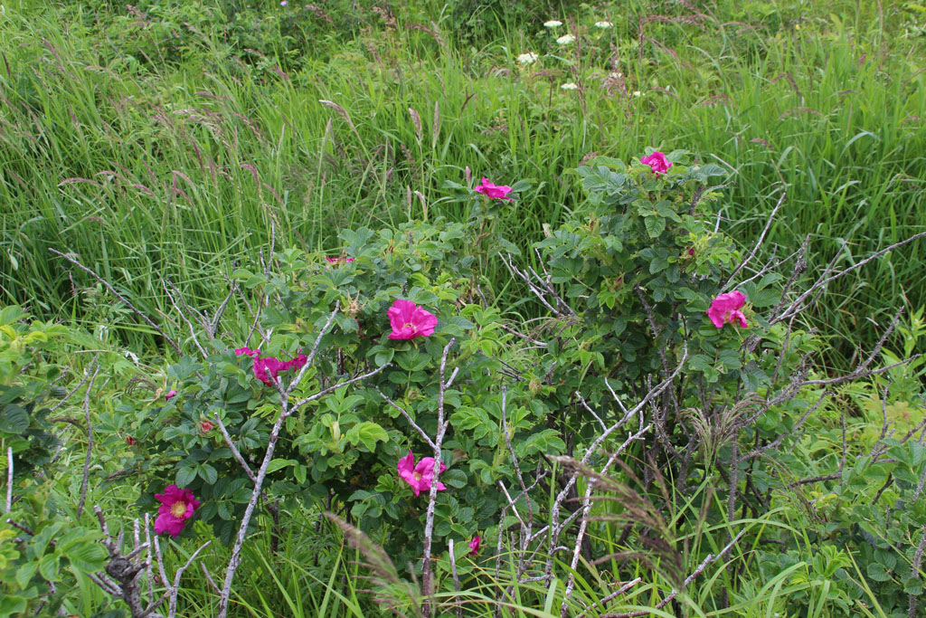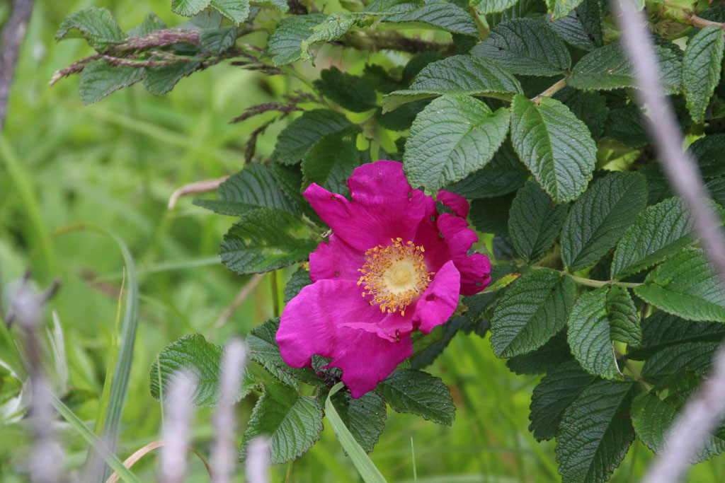 ハマナスの花のアップ。バラ科です。浜の梨から転じたのであって(ハマナスもナシもバラ科)、茄子はまったく関係ありません。