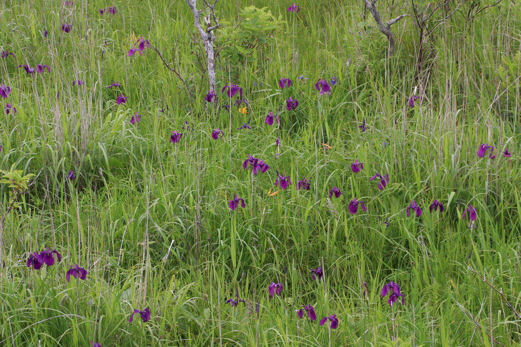 南端に近付くにしたがって、花が増えてきました。このあたりはハナショウブの群落。エゾカンゾウ(ニッコウキスゲ)も混ざっています。