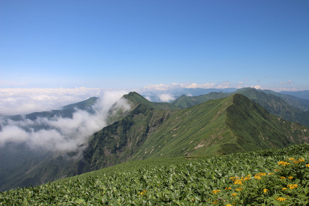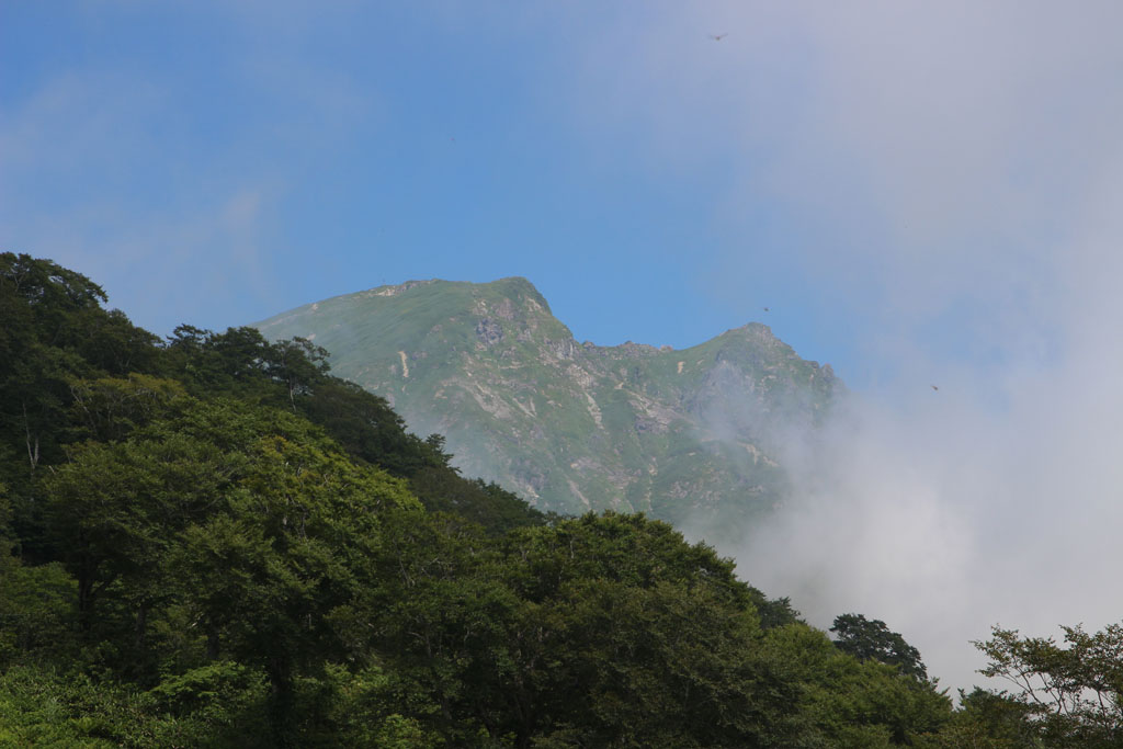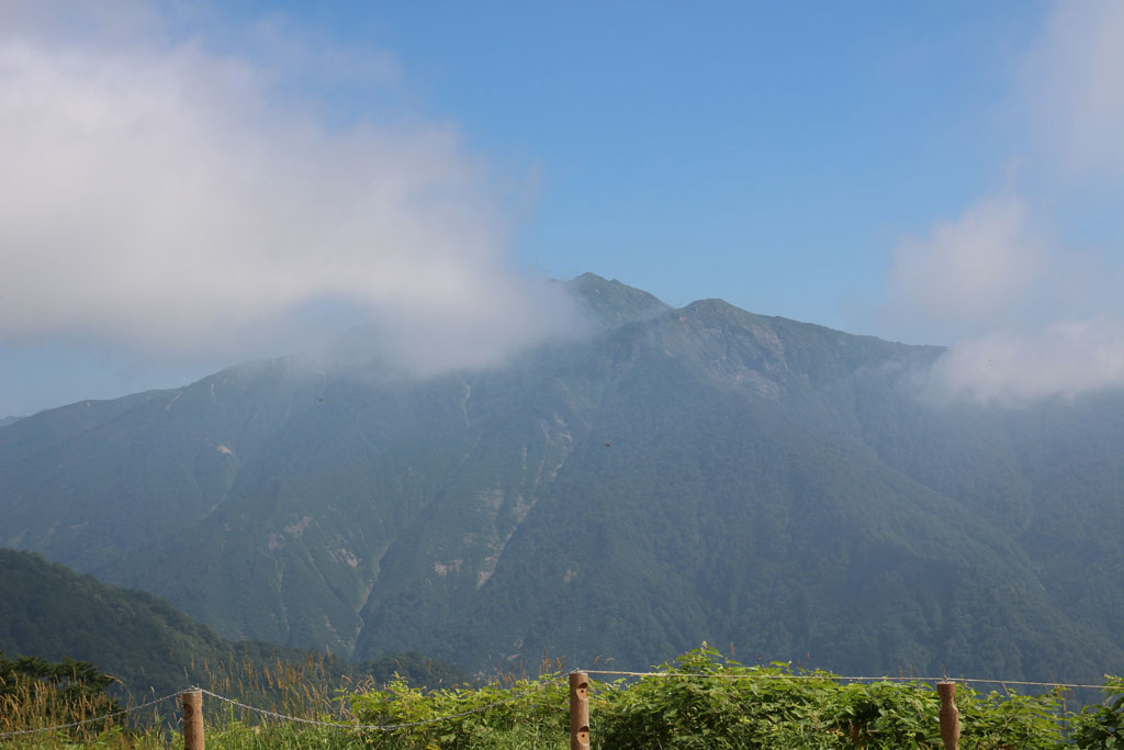 白毛門と朝日岳方面も、ややガスに包まれていますが、だいたい見えます。