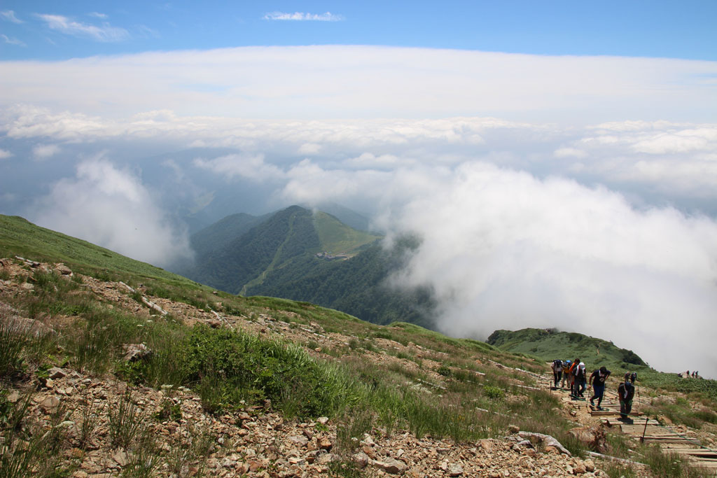 下に、登山口の天神平が見えます。山頂までの標高差は650mくらいなので、体力的にはさほど厳しいものではない、はずです。