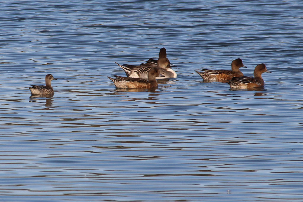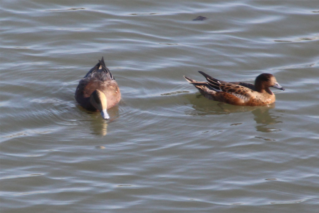 中央のこちら向きのカモ、アメリカヒドリっぽい。野鳥公園のレンジャーさんの話によると、エクリプス(オスの非生殖羽)なので同定し難いけれど、アメリカヒドリか、少なくともヒドリガモとアメリカヒドリの雑種だろうと。