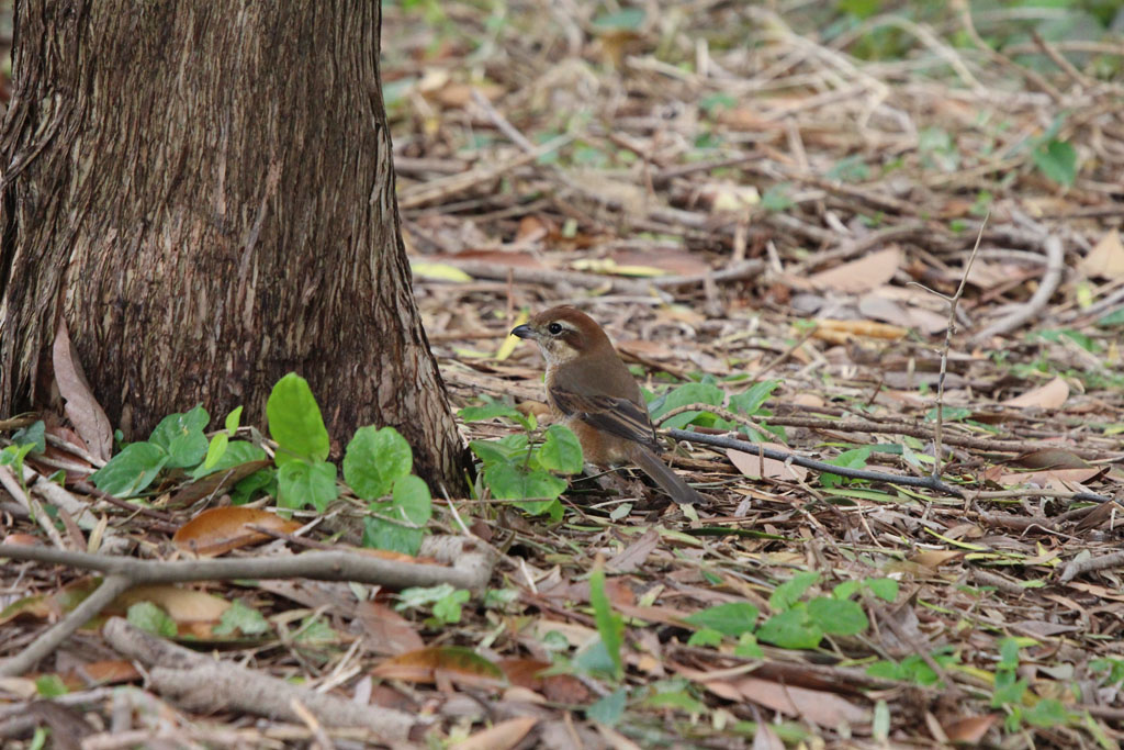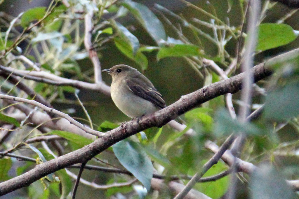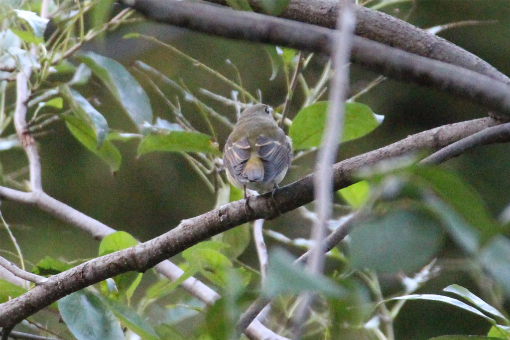 公園西側にて。キビタキのメス。ずらりとカメラが並んでいるので、何かいるんだなと思ったのですが、なかなか発見できず。遠方の樹林の中にいるとばかり思って、必至でそこを探していたのですが、なんと目の前3メートルかそこらしか離れていない潅木に中にいたのでした。そりゃ、見つからないわけだ(笑)