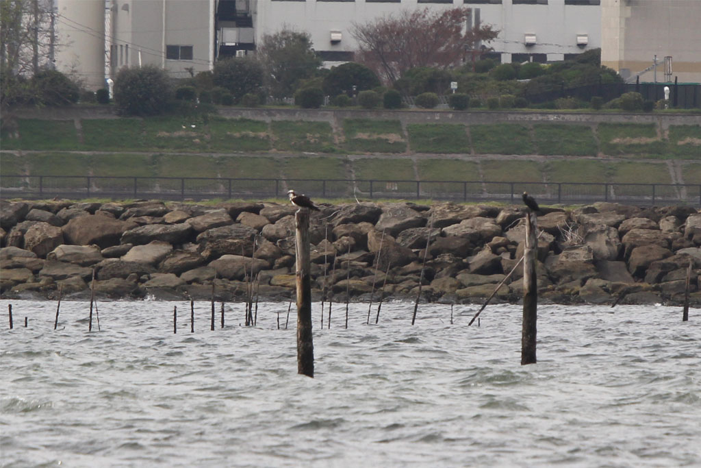 西なぎさのはるか遠方にミサゴ。遠い。もうちょっと近いとよいのですが。風が強くて、カメラが煽られ、撮影は大変でした。