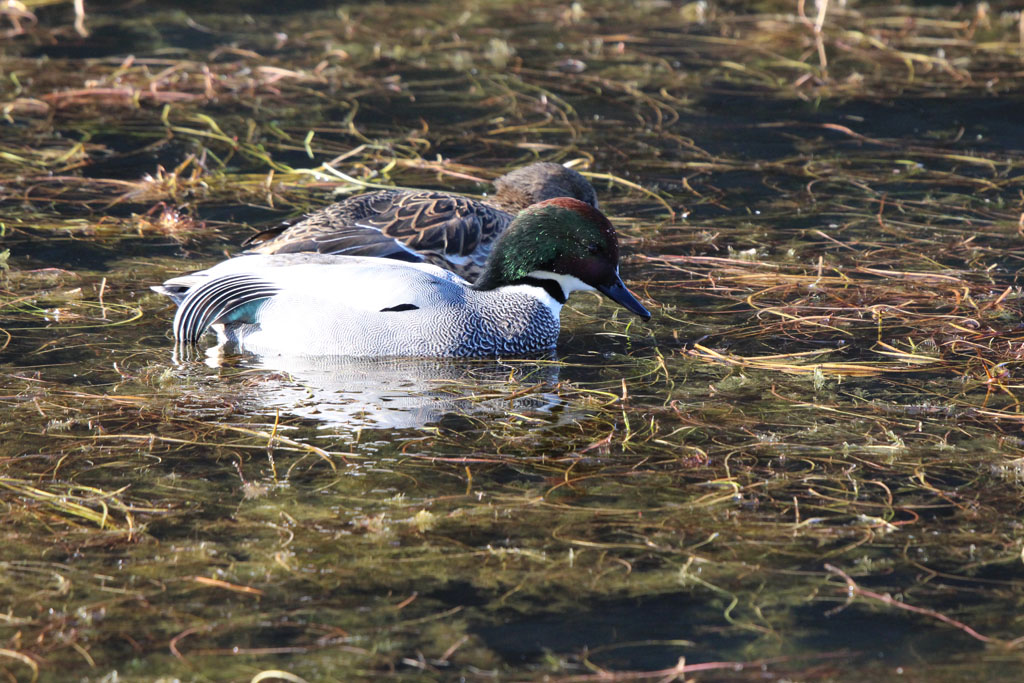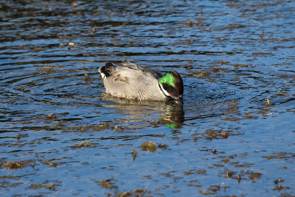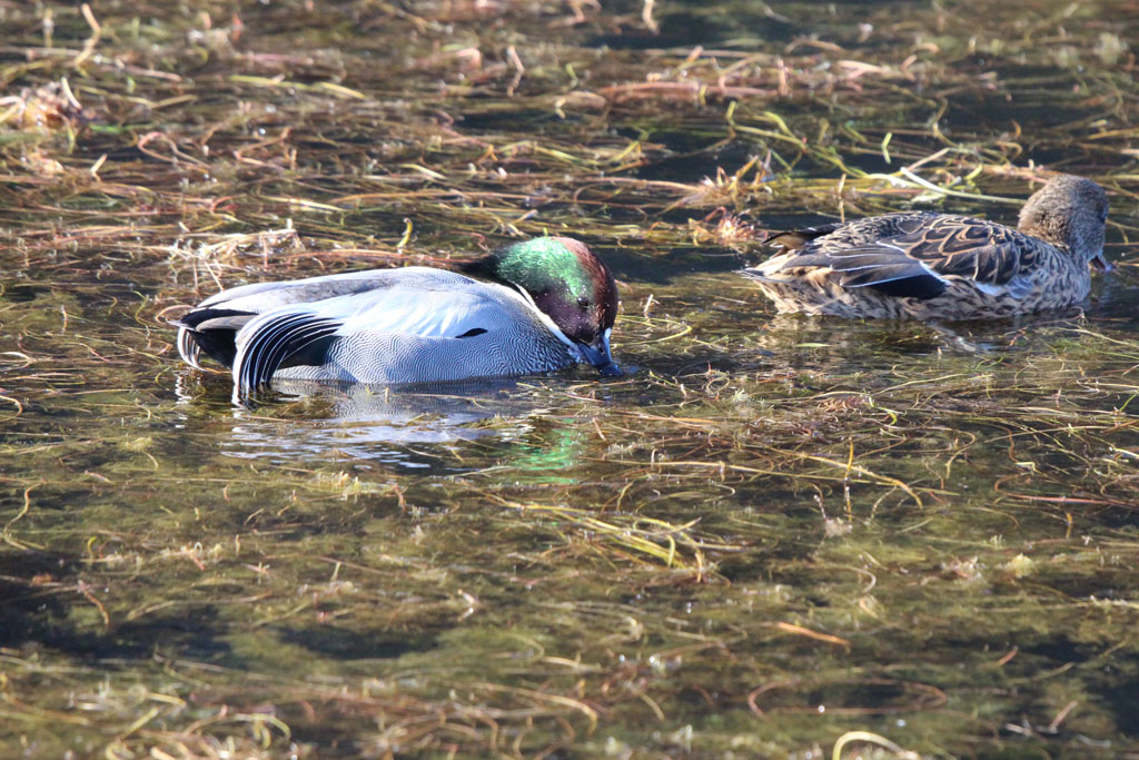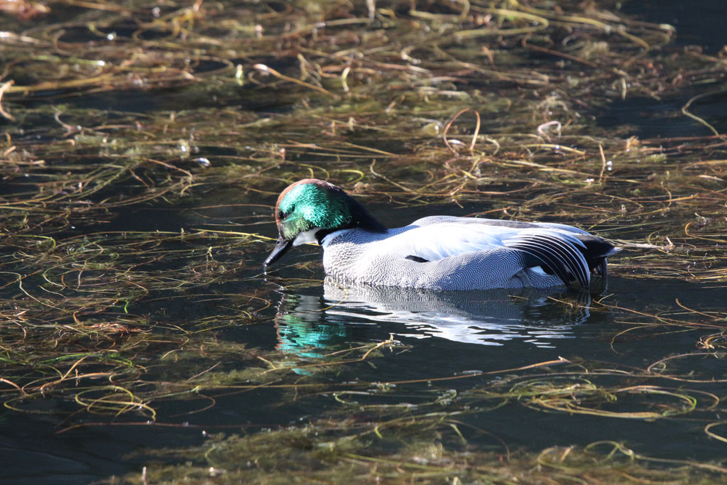 考えてみると、いつも通るところは、水深が深そう。潜水できる海ガモ(キンクロハジロなど)は潜って魚を取れるけど、潜水できない淡水ガモはエサが取れない。でも、桜田壕は水深が浅いみたいだし、水草がいっぱい浮いているから、淡水ガモでもエサが取りやすいんだな。