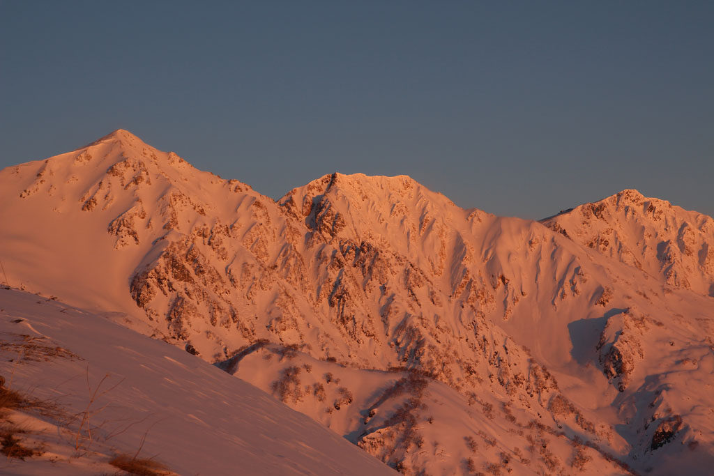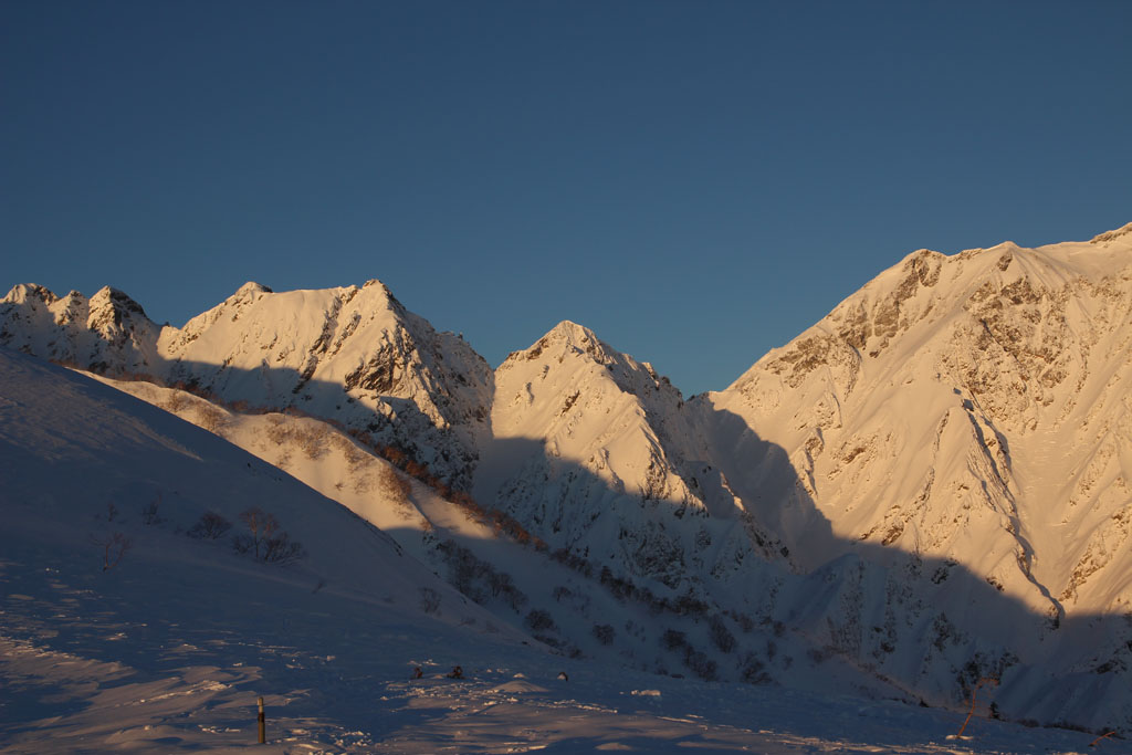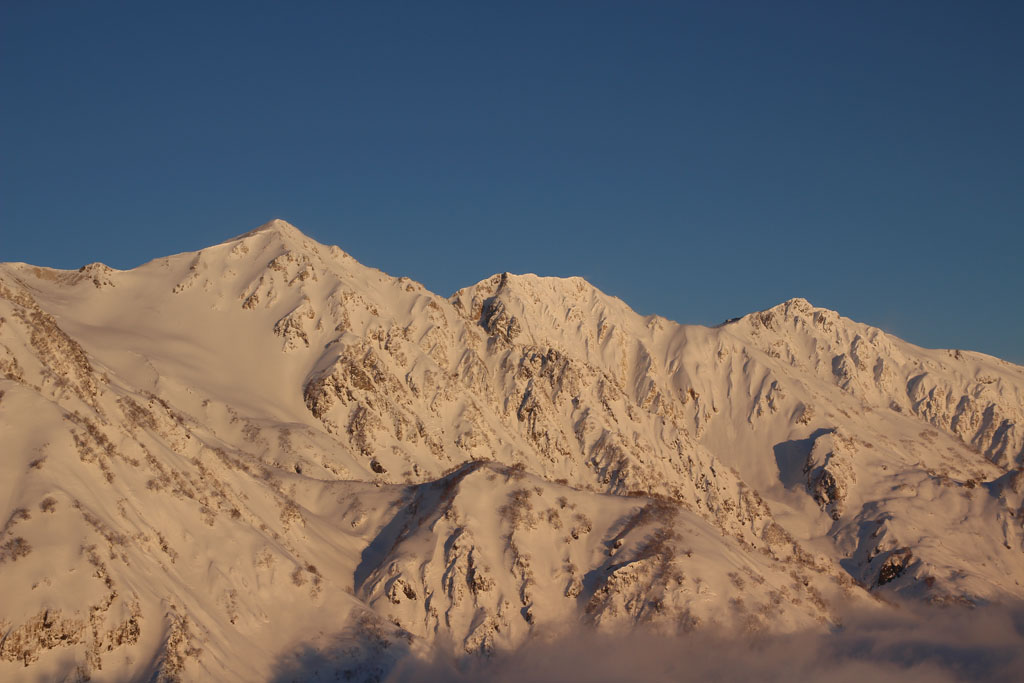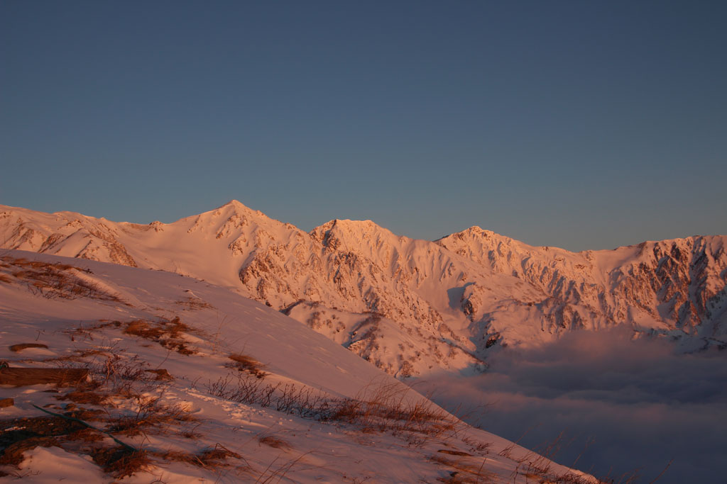 1月の早朝だから、すごく寒い・・・・・・と、言いたいところですが、異常に暖かくて、写真を撮るには右手の手袋を外すのですが、この場所で10分以上撮影していて、特に冷たいとは感じませんでした。服装も、フリースは、着ていると明らかに暑いので、登り始めの時点で脱いでしまいました。もちろん氷点下ではあるのですが、マイナス2~3度?この時期のこの高さ(八方池山荘は標高1800m、この撮影場所はそこから100mか150mくらい登ったところ)の早朝とは思えない気温です。