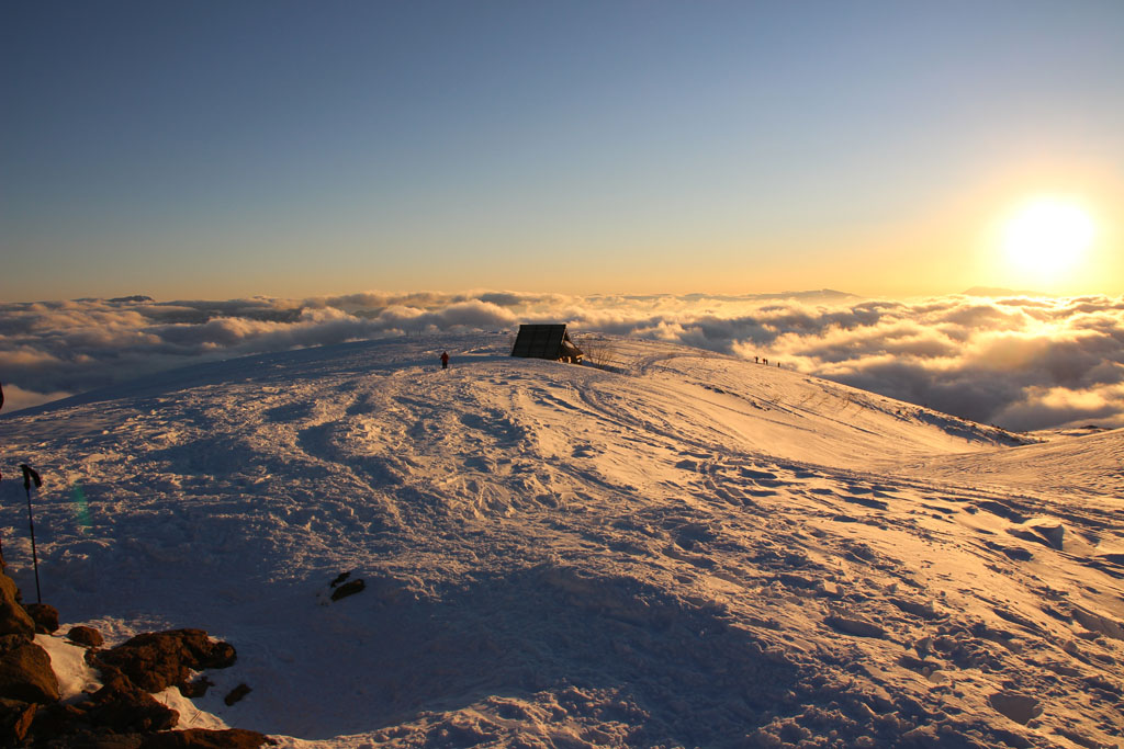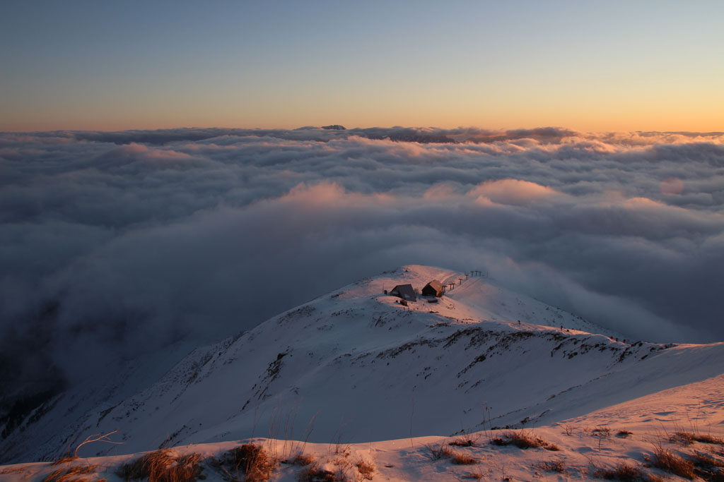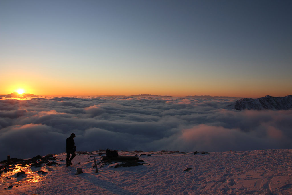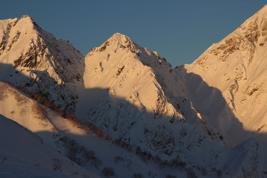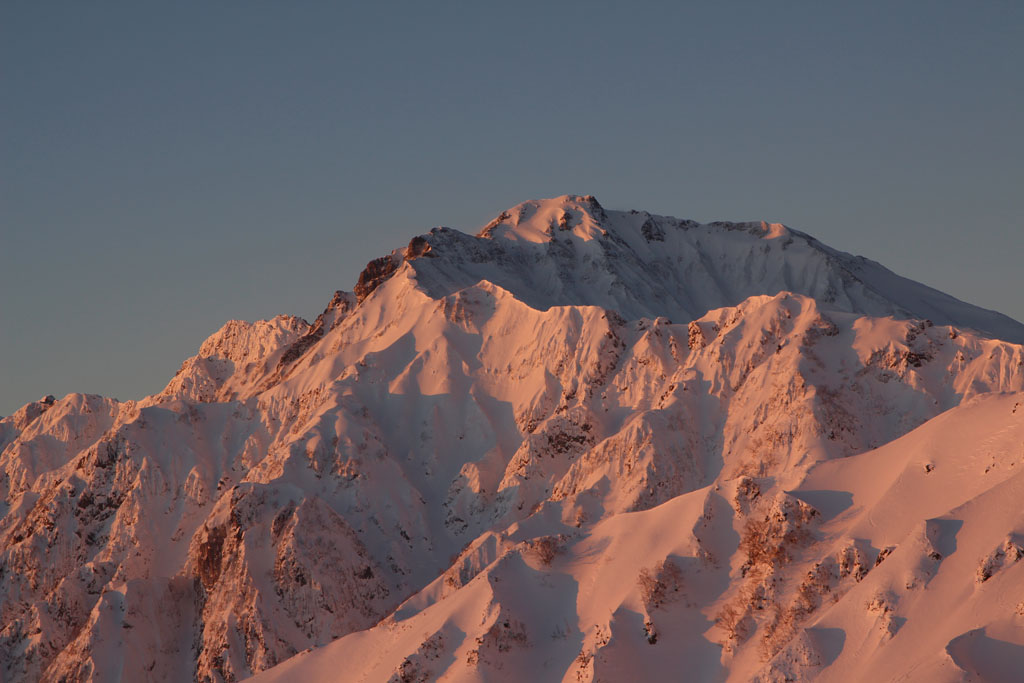 1月の早朝だから、すごく寒い・・・・・・と、言いたいところですが、異常に暖かくて、写真を撮るには右手の手袋を外すのですが、この場所で10分以上撮影していて、特に冷たいとは感じませんでした。服装も、フリースは、着ていると明らかに暑いので、登り始めの時点で脱いでしまいました。もちろん氷点下ではあるのですが、マイナス2~3度?この時期のこの高さ(八方池山荘は標高1800m、この撮影場所はそこから100mか150mくらい登ったところ)の早朝とは思えない気温です。