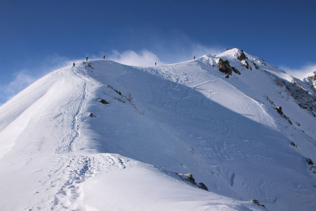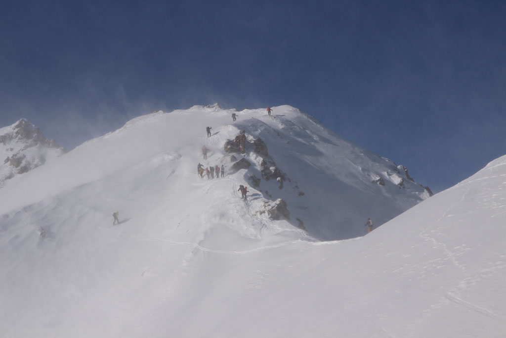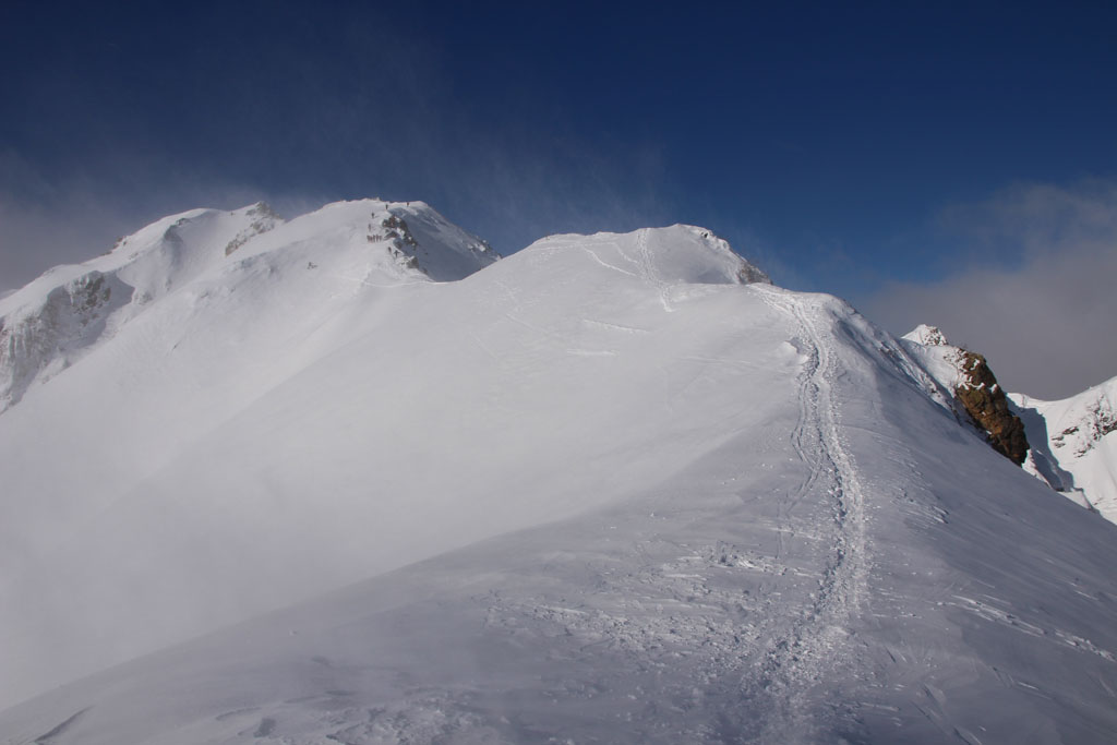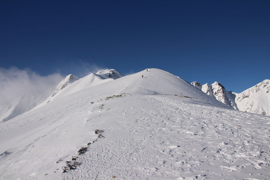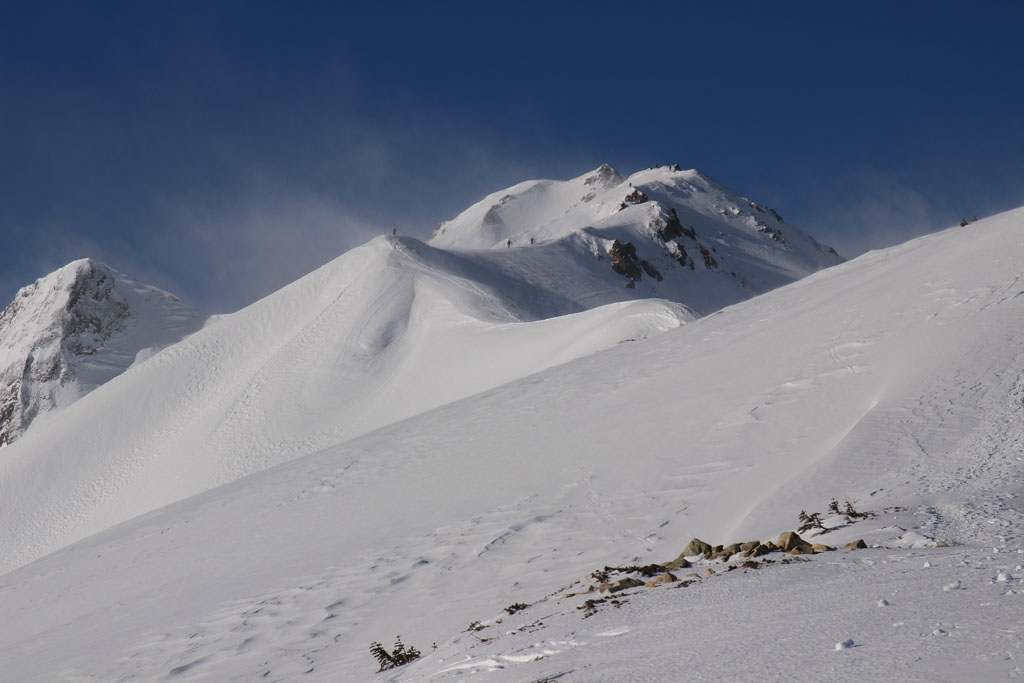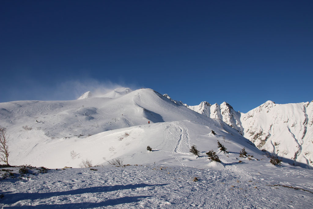 ここまで、風もほとんどなく登ってきましたが、この先ではかなりの強風が待ち受けていることが、雪煙から伺えます。