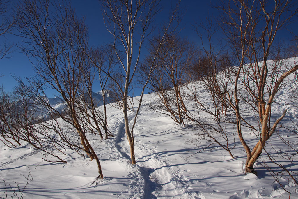そして、登ってきた道のり。結構登ってきたなあ。後で地図を確認すると、水平距離では全行程の8割程度を登ったようです。標高も、おそらく2500mから2550m辺りなで、リフト終点から700m登って、残り150mくらいと思われます。冬季未踏だったら、少し未練が残るところですが、4年前に登っているので、それほどではありません。