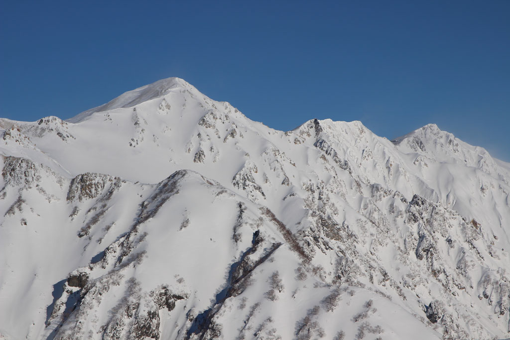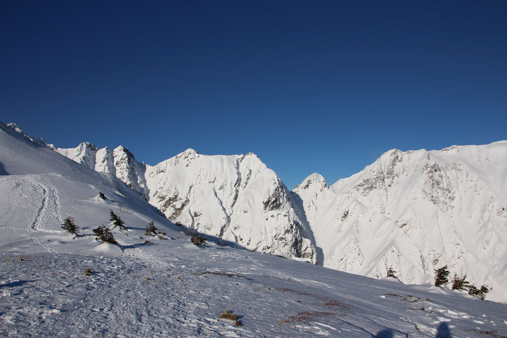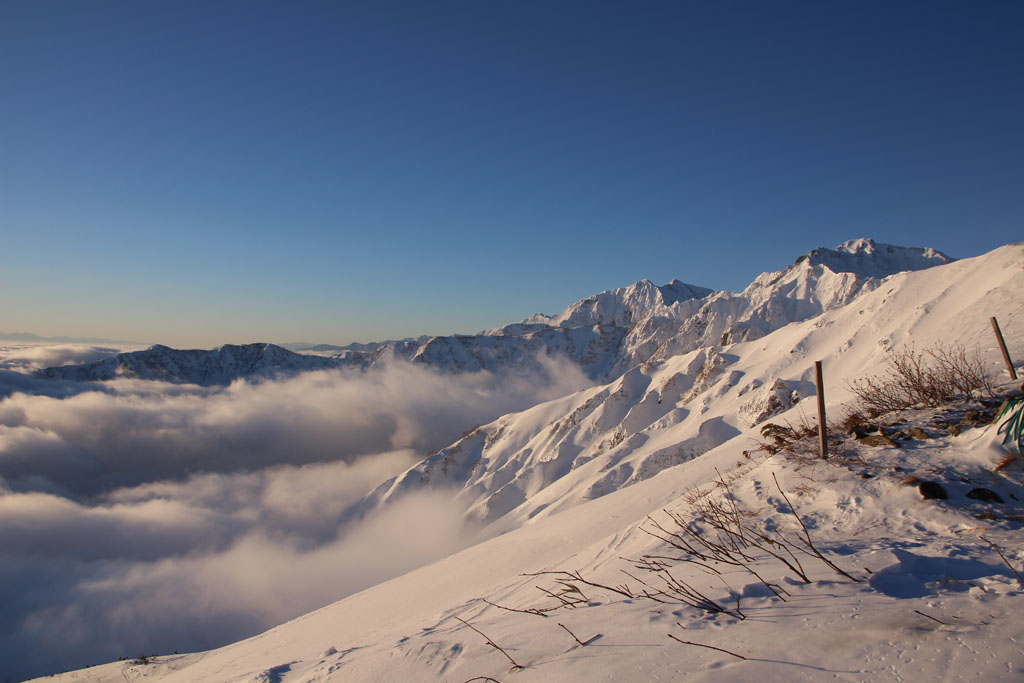 ちなみに、八方池山荘を出発したのが6時40分頃で、この引き返し地点は、写真のデータによると9時52分ですから、所要3時間、このまま順調に山頂まで行ったとすると、おそらく10時半過ぎに山頂に着いただろうと思います。登山地図によると、標準タイムが3時間50分(もちろん、無雪期の標準)なので、冬山にもかかわらず、それと同じペース(しかも、あちこちで写真を撮っていた時間も含めて)で登ってきたようです。