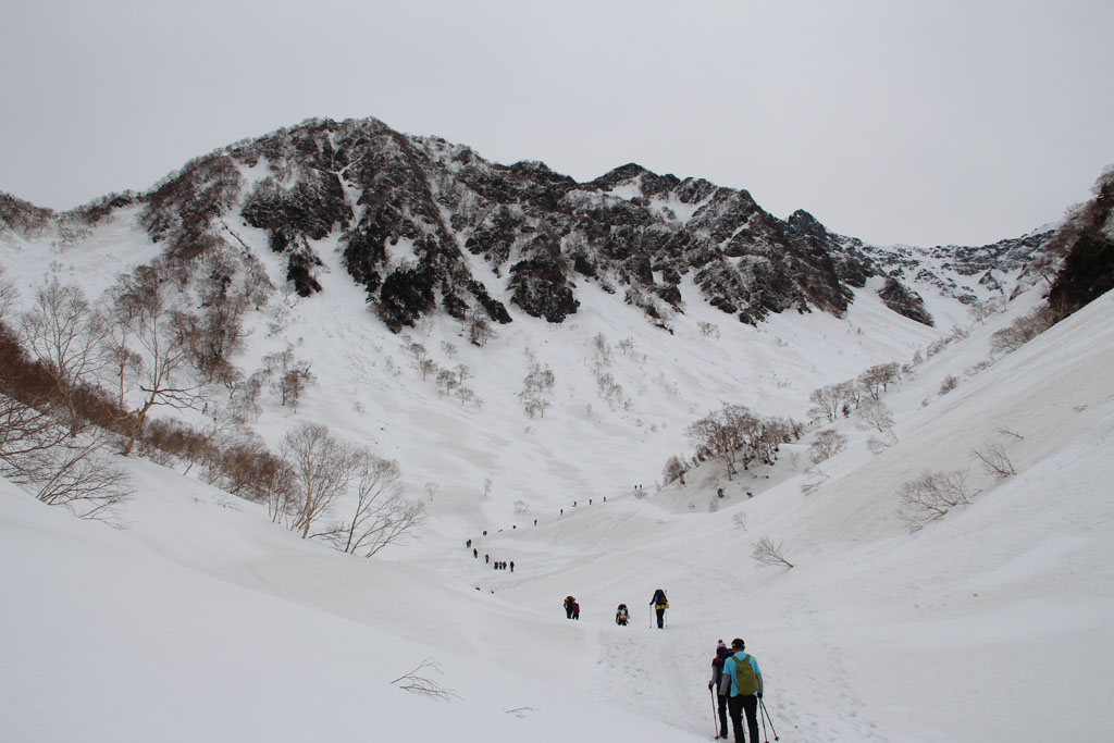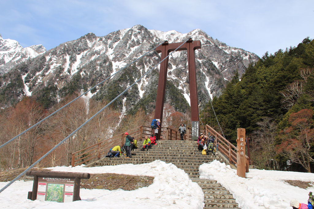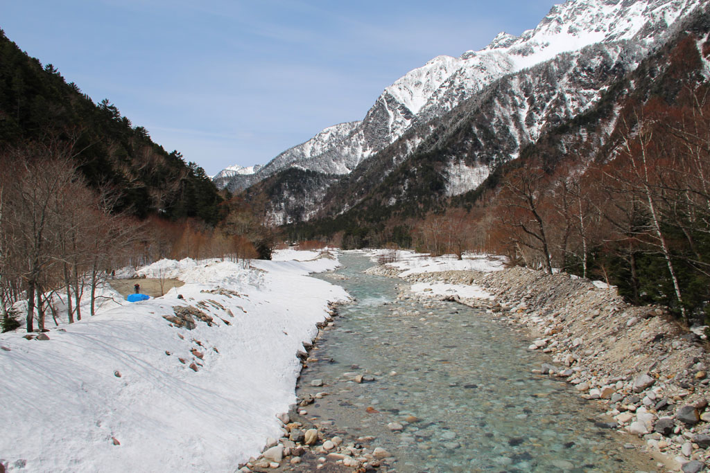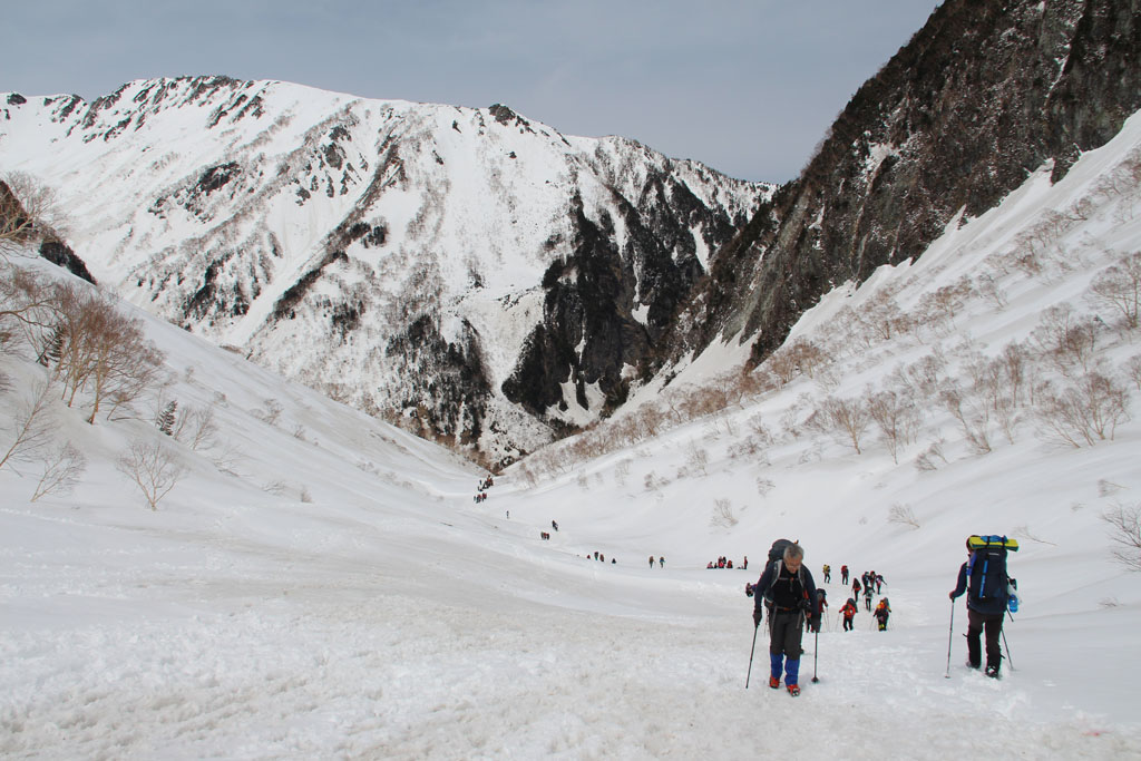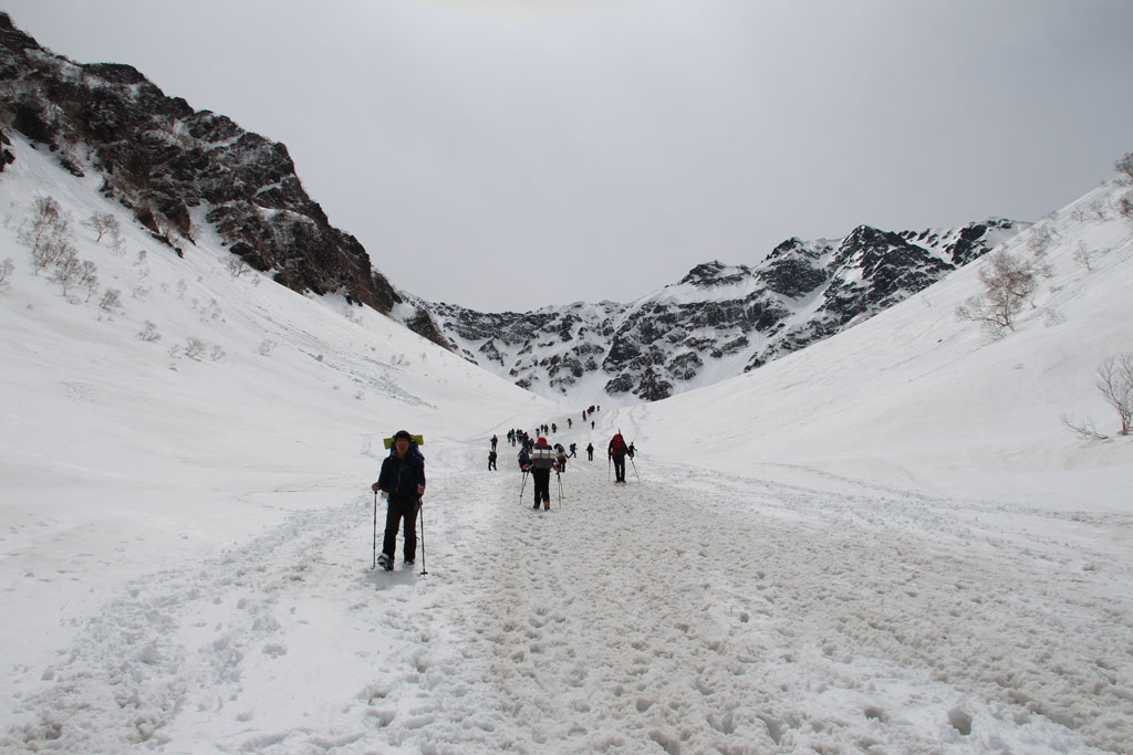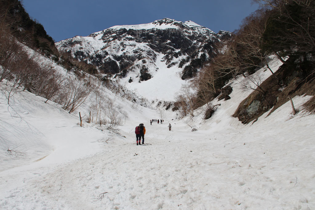 横尾から更に1時間あまり、本谷橋でアイゼン装着。橋、とありますが、橋は撤去されていてありません。