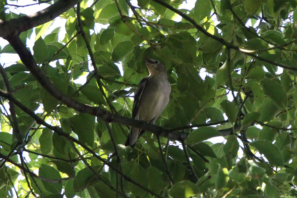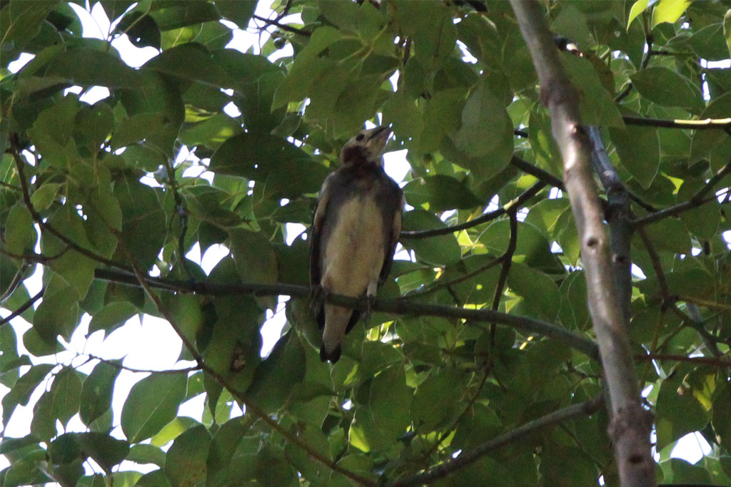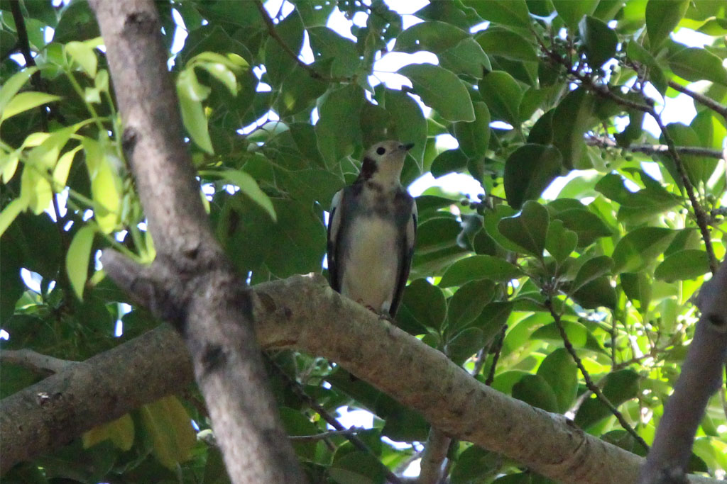 名前のとおりムクドリの仲間です。ムクドリは東京のどこでも見られる、もっともありふれた鳥の一種ですが、コムクドリははるかに稀です。ムクドリと違って夏鳥ですが、繁殖地は北海道、東北と中部地方の高地なので、東京近辺では旅鳥、つまり春と秋(実際は7月終わり頃から9月半ばまで)しか見られません。数が多ければコムクドリだけで群れを作りますが、1~2羽のときはムクドリの群れに混ざっていることが多いようです。今日も2羽がムクドリの群れに混ざっていました。