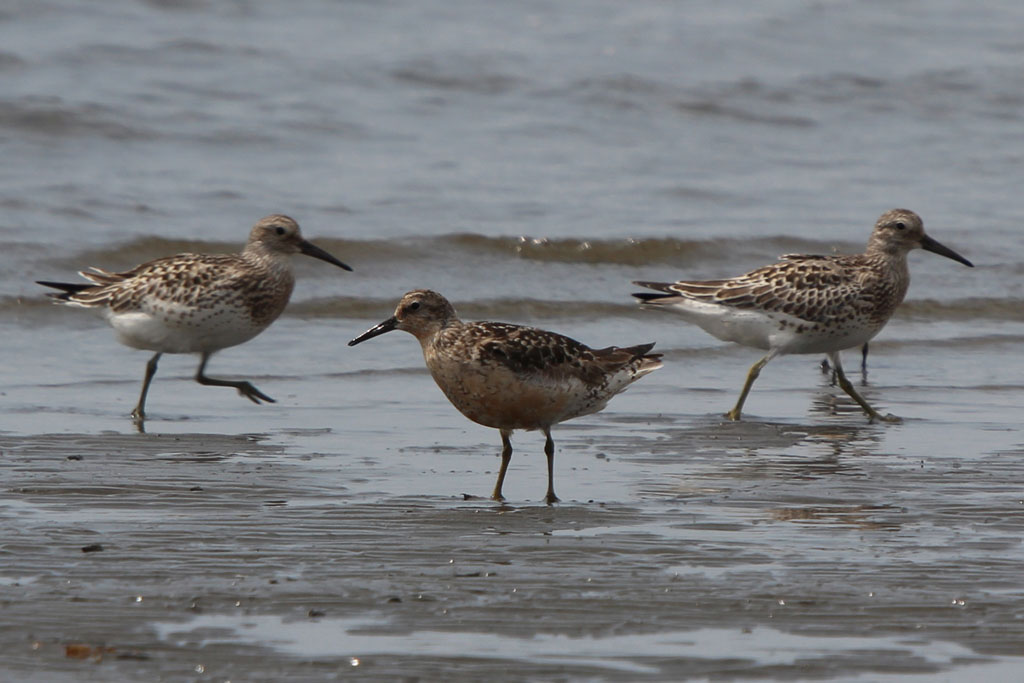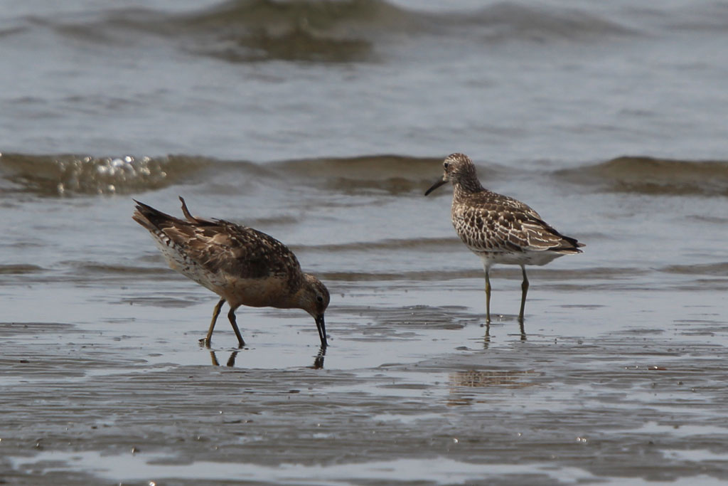 左側ミユビシギ2羽(奥の1羽はハマシギ)と右側コオバシギ
