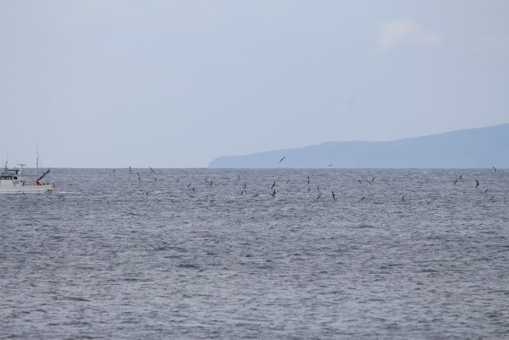 遊漁船の後ろをオオミズナギドリの群が追いかけています。