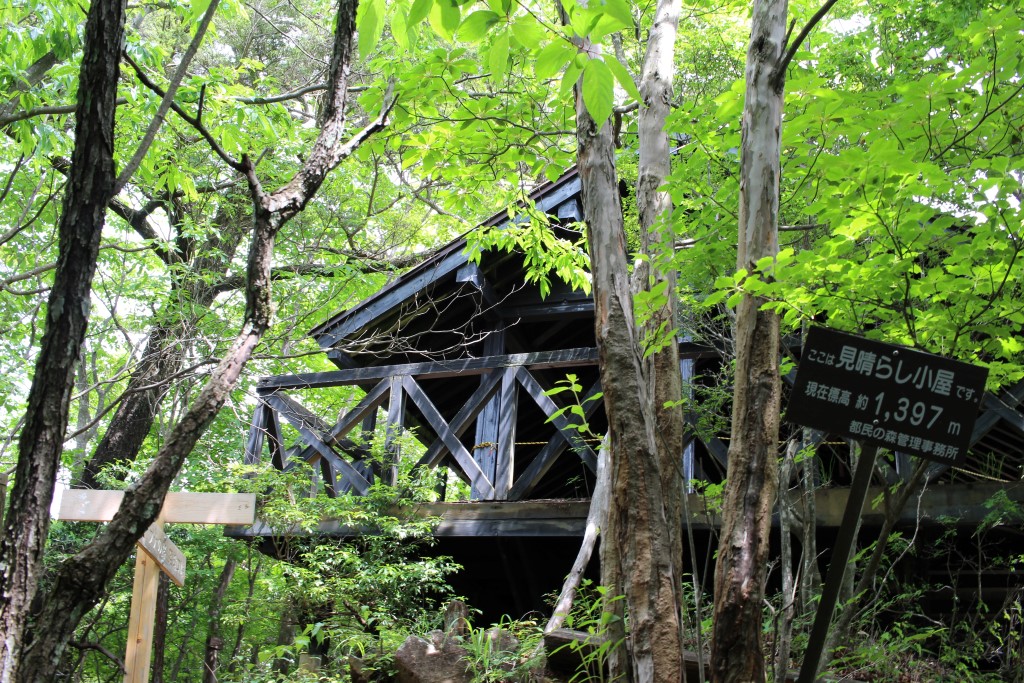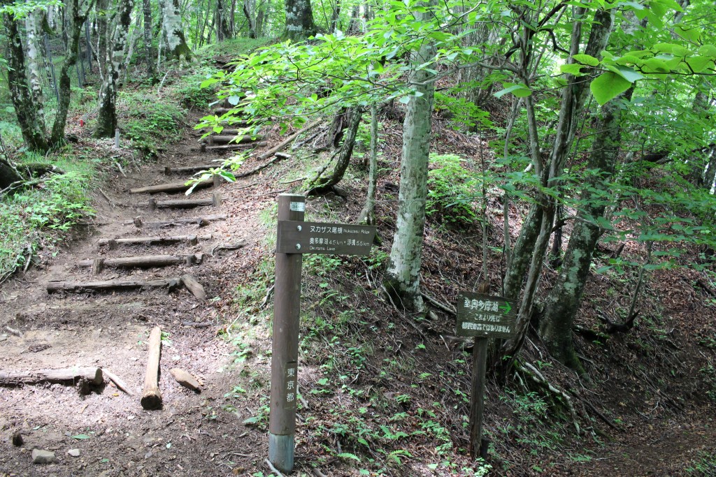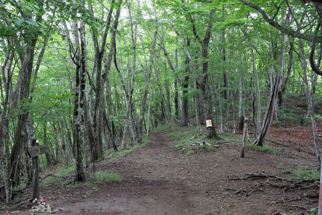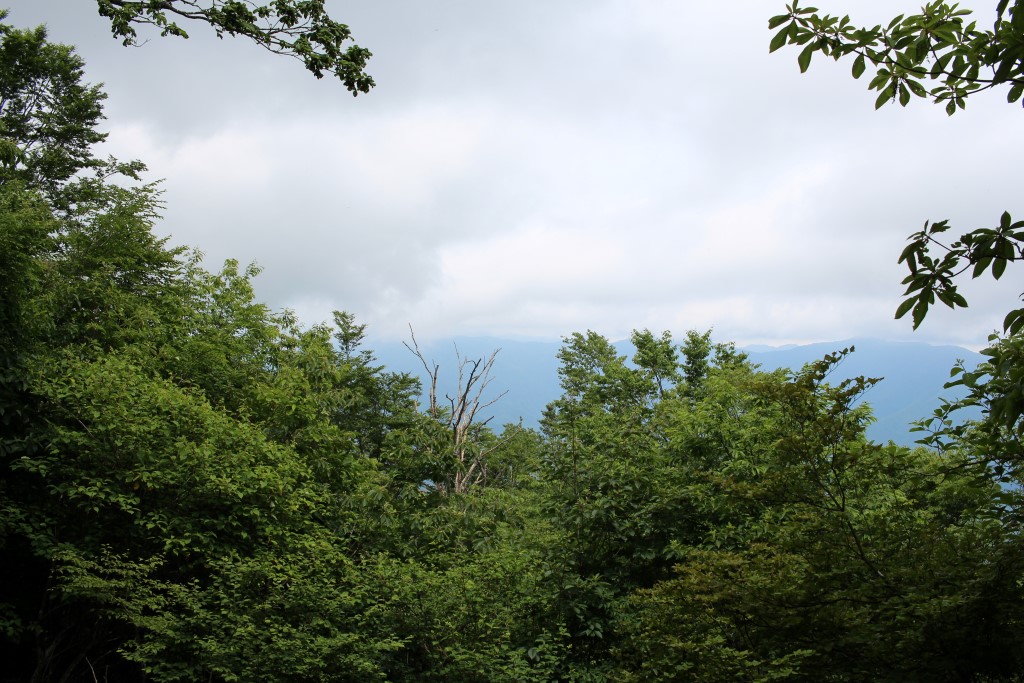 1400mの避難小屋まで下ってきました。ブナ林の中にミズナラとシラカバ(シラカバはこの写真には写っていません)が混ざっています。これも東京です。