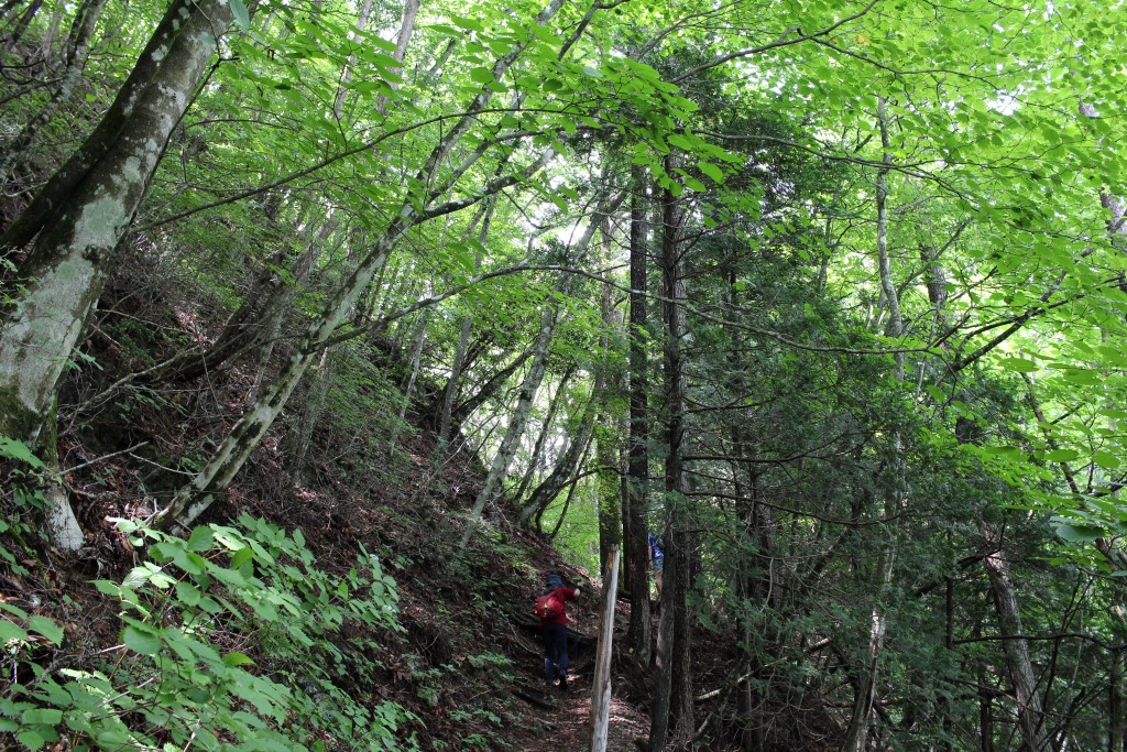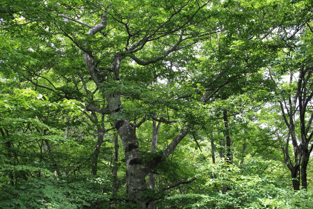 ブナ林。巨木から若い木まで様々です。この辺りから山頂にかけては、ブナの割合がかなり高かったです。