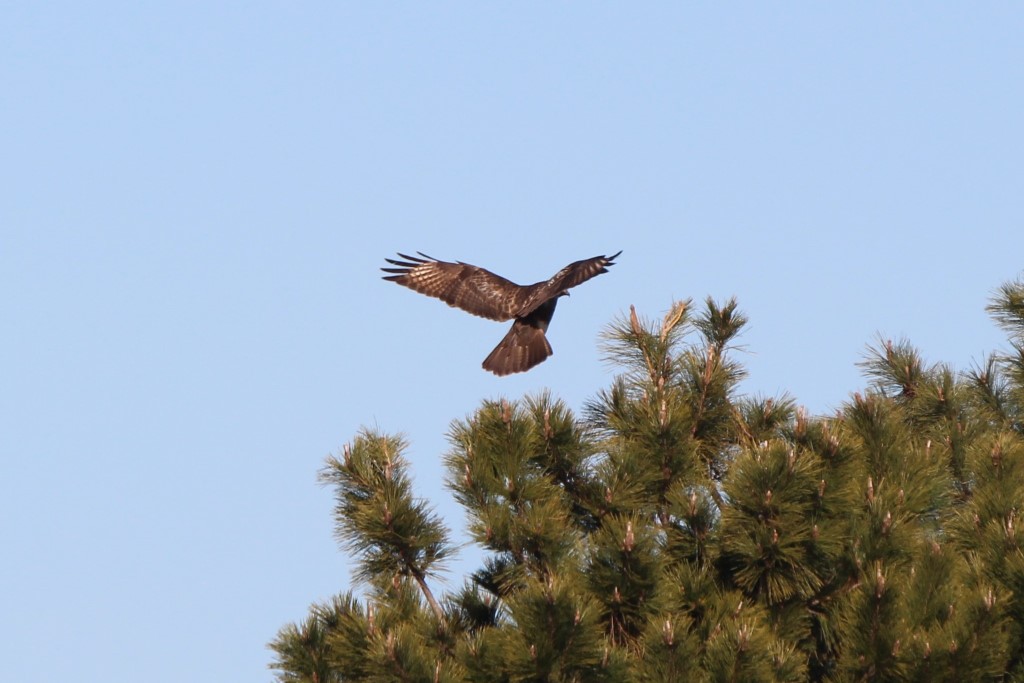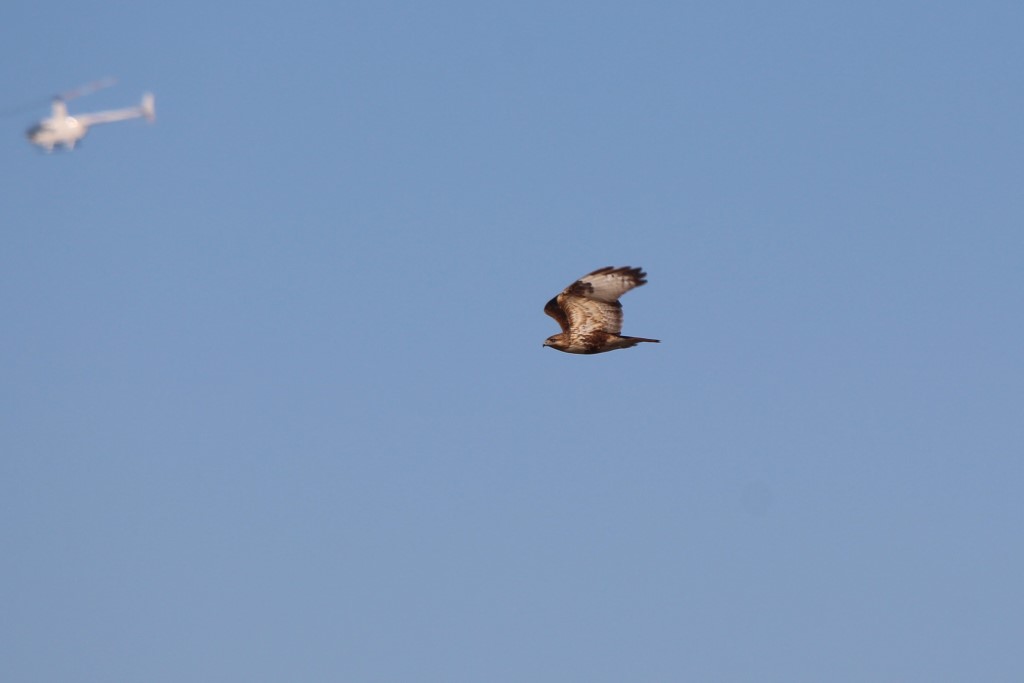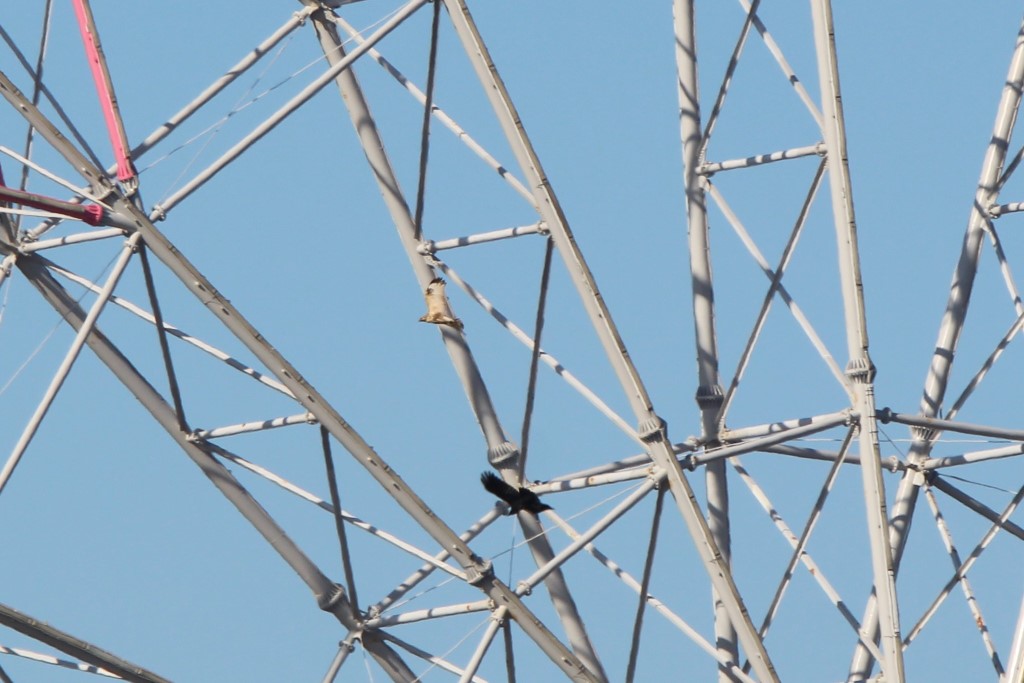 大観覧車を背景に、ノスリとカラスがバトル中。