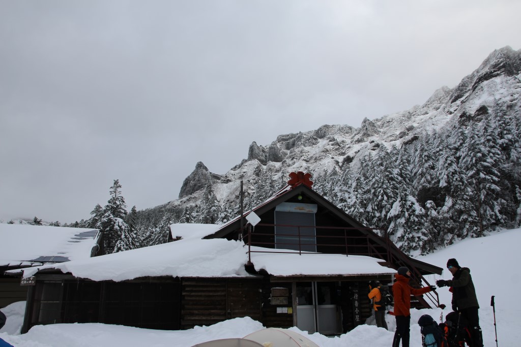 行者小屋に到着。行者小屋の冬季営業は12月30日から1月3日までで、この日は29日ですから営業していません。ただ、テン場には多くのテントがありました。赤岳に登るなら赤岳鉱泉よりここからの方が近いので。