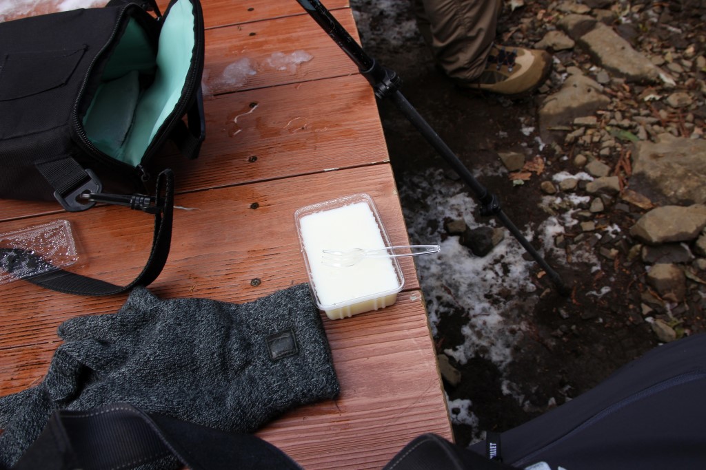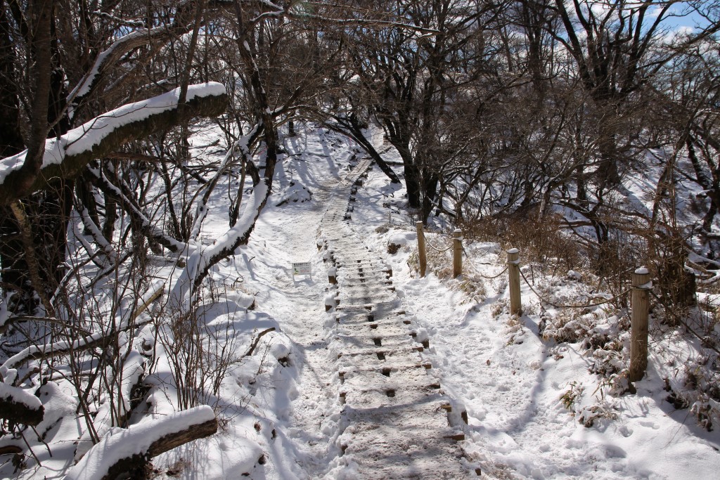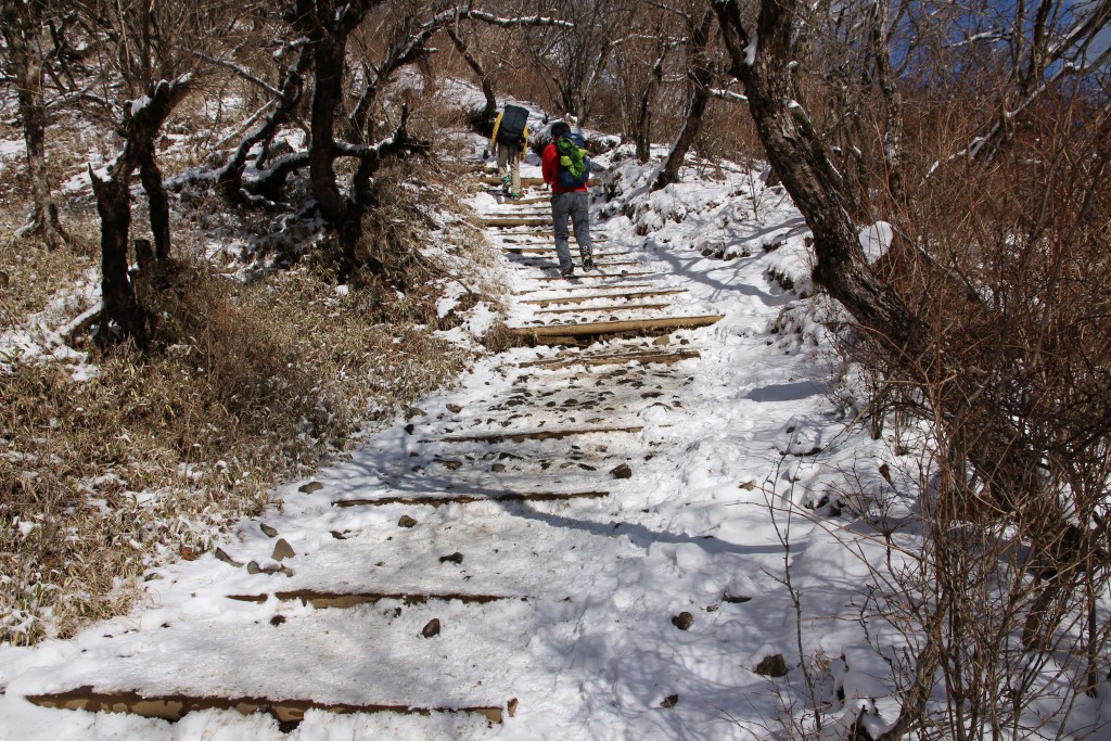 下りの最初の方は一部アイスバーン状態で、ノーアイゼンではやや滑りやすかったですが、特に問題なく下山。