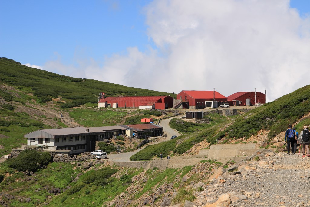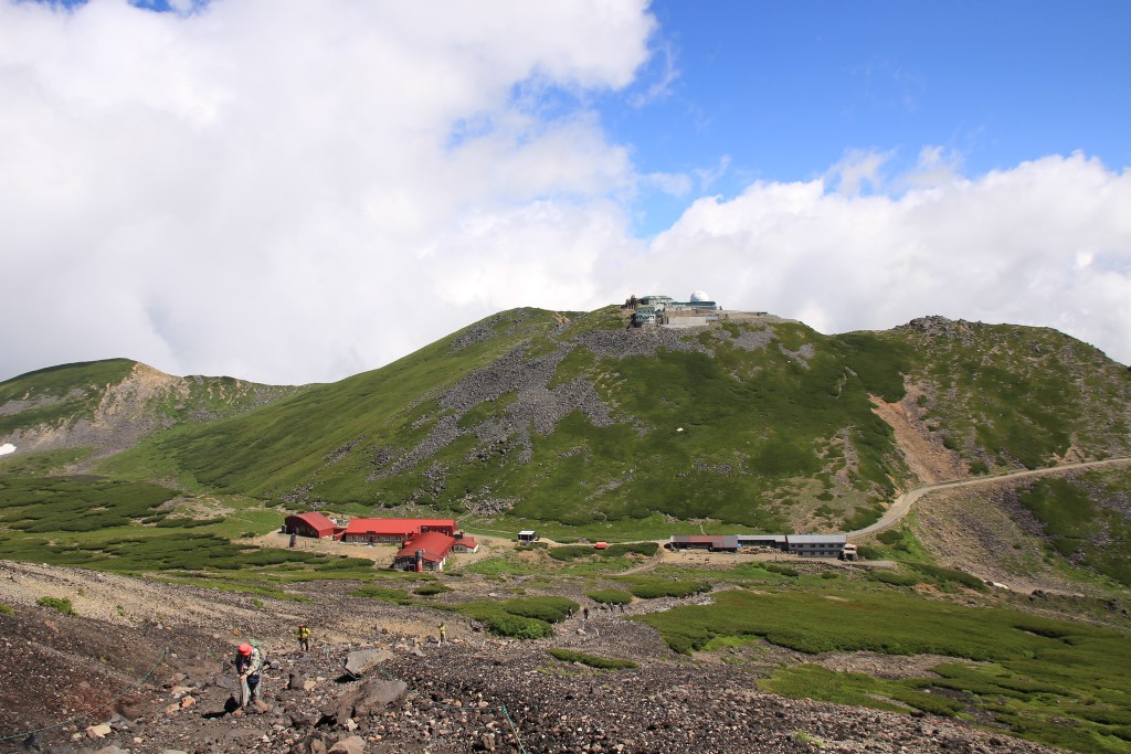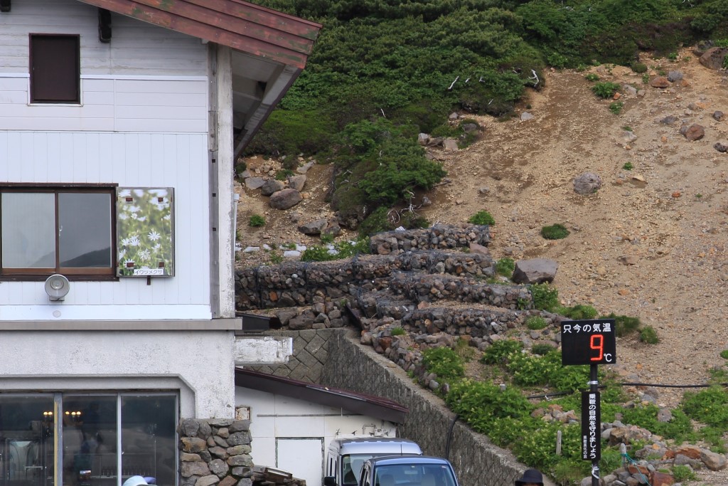 バスの終点は畳平ですが、実はその先、この山小屋(乗鞍岳肩の小屋)まで舗装道路は続いており、小屋の業務用車両は出入りしています。ただ、畳平からここまでは平坦な道なので、標高は畳平までとほとんど変わらないでしょう。