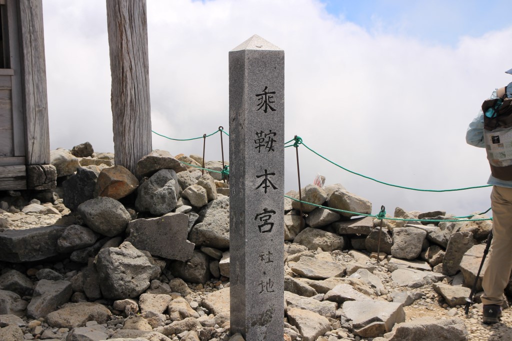 で、山頂に到着。ごらんのとおり、だいたい晴れていましたが、雲が多く、遠方の視界はありませんでした。向こう側に木曽御嶽山があるのですが、見えません。