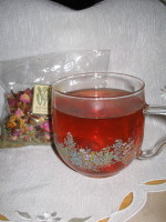 お気に入りのお茶、ハーブティーです。先月のお誕生日の時に頂いたものなのですが、その名も『煌めき美人』。ローズやレモングラス、カモミールなどが入っているのですがちょっと酸味があってとても香りが高く飲みやすいお茶です。お茶の色もローズ色。なんだかすごく安らぎます。普段は珈琲党の私もハーブティーでリラックス♪♪透明のハーブティー用のカップもセットで頂いたのですがこのカップでお茶を飲むと、香りも、味も、色も、楽しめるのです。素敵な安らぎの時間を演出してくれる大事なアイテム♪♪煌めき美人humapさん、 humaxさん、ありがとうネ~!!