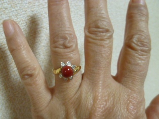 今日は朝からリハビリに行って来ました。理学療法士は、土曜日は一番若い子が担当。でもって、案の定、足が痛くなって夜眠れんかったわ(シクシク…)今日の担当はリーダーの理学療法士の方だったので「足先が痛かった」と言っていたら、丁寧に施術してくれた。やはり腕前には、かなり差があるような…でも、若い理学療法士も経験を積まないと上手にはならないので、そこは仕方のない面もある。治療は経験の浅い人に施術してもらっても、ベテランにしてもらっても払う治療費は同じなんだよね(笑)世の中はこれが普通です。歳若い彼もこういう下積み時代を乗り越えて、うまくなっていくに違いないと信じよう。私はぼちぼち春季イベントの準備にとりかからなくてはならない。会場の予約が決まれば、参加者を募ったり、パンフレットの制作も始める。イベントの規模は以前より縮小したので、企画する側としては気持ちが楽になった。ゲスト講師を招いてた時は参加者が少ないと、お越しになる先生に申し訳ない気持ちになって必死で参加者集めに走り回っていた。そして、講師料が有名な講師であればあるほど、高かった。生徒達は現在の不況でリストラされ職を失った人や、取引先の仕事を削減された人、新しい仕事をみつけても収入が減った人も多くいた。それでも、生徒達が苦労しても夫に黙ってついてきてくれる姿を見て、もう、夫の生徒達に余計な負担をかけるようなことは止めようと思った。イベント企画はこじんまりとしたものにはなったけれど、みんなの団結は強まった。同じ苦境を共に乗り越える時、人間と人間の心は強く結びつく。小さな団体ではあるけれど、そういう体験も必要だったのだろう今日の私のお供はこちらの指輪…アートコーラルさんのオークションで購入した血赤珊瑚のリングメレダイア入ったK18&K18WGのコンビ使いの可愛いデザインが気に入っています。私はグレーの服を着た時にさし色に赤色のジュリーを使う事が多いです。