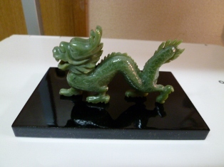 私は元日に到着した年賀状を見て、友人とメールのやり取り。メールでの会話は2月末に行く旅行の計画の相談。1月末には親友の姫も滞在中の中国から帰国されるので、いつもなら姫とも帰国に合わせて二人で温泉へ出かけるのですが、先日の骨折の完治は3ヶ月程かかるらしく、今回はパスすることにしました。9月に二人で行った風の盆の写真を手渡しすると約束していましたが、愛知までは行けそうにないので、写真プリントを送るとメールしたらパソコンに送ってとメールが来ました。デジカメで撮った写真を携帯に移し替えてメールにして送るという方法は、まだ、経験したことがないので来週、パソコンの先生に教えてもらってから、姫に送ることにします。姫とは喧嘩していたのじゃないかって?そうなんす(笑) また、喧嘩していたんですよ。でも、私達は40年以上の長い付き合いですから、喧嘩していても元に戻れるんです。二人の間の喧嘩はしょっちゅうなのだけど、そんな簡単に“絆”が壊れるような関係ではないのです。何せ、私達は互いに波長の違う「御魂磨き」の“運命の友”ですから自分を磨くために、互いに成長するために、互いが互いを必要としていると思います。それは一生変わらないと思うし、死ぬまで姫とは変わらぬ友達であり続けられると信じられます。もう、とっくに仲直りしていまして、私の足が完治していたら姫と一緒に2月初めに温泉に行っている筈だったのだけど、今回の姫の日本滞在期間も短いし、私も予定が結構詰まっているので、次回姫が帰国した時の楽しみとしますさて、翡翠の龍我家の龍です。この翡翠は軟玉(ネフライト)です。夫が20代の頃に台湾へ招待された時に購入して日本に持ち帰ったもの。なかなか良い造形ですね