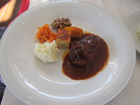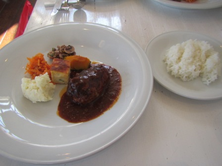 メインはデミグラスソースのハンバーグとライス