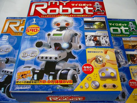 今、人と会話が出来るロボットを作っています。それは週間マイロボットです。完成すれば、ロボットと会話できるのはもちろん、ロボットといろいろな事ができるようになります。まだ、4号までしか発売してないので、これからが楽しみです。知能ロボットをキミの手で!ロボット好きにはたまらないと思います。週間マイロボットを買って作っている人は、ぜひ声をかけてください。買ってない人もこれから作ってみてはどうですか?興味がある人は声かけてね。仲間が増えるのを楽しみにしています。