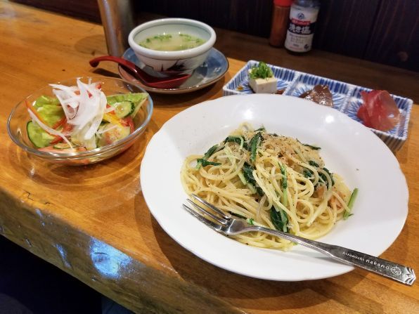 -ソロで行っていないプチ遠征記-『鉄火鳥でランチ』今日のお昼は、夜の会で月一訪問する「鉄火鳥:リンク多いのでたどってください」さんです、、、暫くお休みしていたランチが再会されたのですねぇ。。。[ランチ(ちりめんと水菜のパスタ):¥750]午後1時半頃に入店すると、カウンター席には夜の会のメンバーさんが座っていました、、、なので私もカウンター席に着き、二種類選べるパスタのランチから"ちりめんと水菜のパスタ"で発注です。。。[ちりめんと水菜のパスタ]するとまず前菜、サラダ、スープが出てきました、、、注文が入ってからパスタを茹ではじめるので、多少時間がかかるようです。。。まぁ、そのための前菜類ですが、この三種盛はお酒が欲しくなりますねぇ(笑)、、、やがて待つこと約11分、"ちりめんと水菜のパスタ"ができあがりました。。。[前菜(冷奴・鰹のヅケ・生ハム)]さぁ気になるお味です。。。パスタはペペロンチーノでしょう、、、フライドガーリックが香り、ちりめんの塩気、水菜のシャクシャク感がGOOD!! もちろんパスタはアルデンテですネっ!!うんうん、旨い旨い~☆[麺リフト、サラダ、スープ]それにこれだけのボリュームで、お値段750円はかなりお得です!! パスタ二種も、日替わりで変更されるそうですので、楽しみ楽しみ。。。(^_-)/[メニューは二種類]*************************************************【お店の情報】住所:愛媛県今治市旭町2丁目3-15 電話:0898-33-2040営業時間:11:30~14:00頃、17:00~23:30定休日:日曜日席数:約40席駐車台数:4台HP:?*************************************************