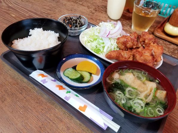 -ソロで行くプチ遠征記-『この唐揚げも好き!!(黒潮)』今日のお昼は、ソロで久しぶりに「黒潮:リンク多いのでたどってください」さんです、、、「黒潮」さんの"唐揚げ"が食べたかったのですねぇ。。。[若どり 唐揚げ定食:¥600]午後1時半頃に暖簾をくぐると、お客産はいませんでした、、、私は席に着き、迷わず"若どり 唐揚げ定食"をご飯少なめで発注です。。。やがて待つこと約6分、、、定食ができあがりました。。。[唐揚げアップで]さぁ気になるお味です。。。メインの皿にはサラダと6個の唐揚げが、山のように盛られていてボリューミーです、、、シットリとした柔らかい鶏肉は、ほんのりにんにく香る醤油系の下味が染みていて、、、一口囓るとジュワワワ~っ!! と肉汁が口中に拡がります。。。また最近の流行はパリパリの固い衣ですが、、、「黒潮」さんのものは、サクっとしているものの、やや柔らかくて昔ながらの"今治センザンキ"のようなタイプでしょう。。。パリパリ衣の"唐揚げ"も良いけれど、、、私はこんな"唐揚げ"も好きですねぇ。。。うんうん、旨い旨い~☆[各アップで]また"ひじきと糸こんにゃく"の小鉢に"漬物"、それに松山揚げの入った"味噌汁"が付いて、お値段はず~っと変わらず600円、、、お財布にも優しい「黒潮」さんの定食です!!