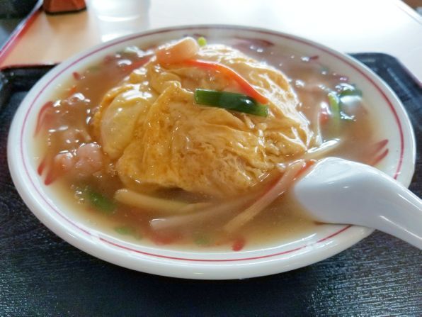 -ソロで行っていないプチ遠征記-『広東風オムそば(錦海楼)』今日はお昼の時間に労働保険の年度更新に行き、その帰りに「錦海楼」さんです、、、なんと9年ぶりの訪問でしたねぇ。。。[お店外観]うちの店から遠いのと、いつもお昼時は車がいっぱいだったのですが、今日は駐車場も空いていました、、、午後1時20分ころに入店すると、店内には10人位のお客さんです。。。[広東風オムそば:¥850]私は空いていたテーブル席に着き、メニューを確認、、、ほぅほぅほぅ、"広東風オムそば"、、、見慣れないメニューなので、コレにしましょう。。。やがて待つこと約6分、、、"広東風オムそば"のできあがりです。。。[オムそばアップで]さぁ気になるお味です。。。まず見た目は"餡かけ堅焼きそば"、、、どこら辺がオムなのでしょう。。。と、麺を餡から引き上げいただくと、、、あれっ!? 麺は堅いけどフワっとした卵の食感があります。。。なので麺をよく見ると、おおぉぉぉ、麺の下に卵が張り付いています!![さらにアップで]構造的には最下層が玉子焼き、その上に堅焼きそば、そして餡となっているのでしょう、、、その餡には少し厚味のある豚肉、イカ、むきエビ、キクラゲ、椎茸、白菜、人参、もやし、ニラなどが綴じられています。。。[各アップで]いやあぁぁぁ、知らなかった、、、こんな"オムそば"があったのですねぇ。。。私のお気に入り味覚にバッチリ、マッチングです!! うんうん、旨い旨い~☆[メニュー]*************************************************【お店の情報】住所:愛媛県今治市美須賀町2-2-4 電話:0898-31-1452営業時間:11:00~22:00定休日:月曜日席数:約100席駐車台数:16台HP:?【メニュー】(一例)※記事中写真ご参照ください*************************************************