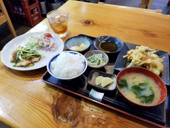 -ソロで行っていないプチ遠征記-『地えびといかのかきあげ・鶏ムネ炒め(ふうど)』今日のお昼はランチの王様「おんじき家 ふうど:リンク多くなったのでたどってください」さんです、、、店主さんにお届け物があったのですねえ。。。[日替り定食(地えびといかのかきあげ・鶏ムネ炒め):¥950]午後1時過ぎに暖簾をくぐると、他にお客さんはいませんでした、、、まずお届け物を渡し、今日は"日替り定食(地えびといかのかきあげ・鶏ムネ炒め)"をお願いしました。。。やがて待つこと約4分、、、定食のできあがりです。。。[地えびといかのかきあげ]さぁ気になるお味です。。。まず"地えびといかのかきあげ"は、天つゆでいただきます、、、サクサクに揚がった天ぷらは、地えびの芳ばしい風味と、イカのモッチリした食感がGOOD!![鶏ムネ炒め]また"鶏ムネ炒め"も、少し甘い大根おろしのタレがかかり、白いご飯との相性バッチリです!! 小鉢のジャガイモは新ジャガかな!? うんうん、旨い旨い~☆[各アップで1]そうそう「ふうど」さん、夜の営業も再開されていますが、やはりまだお客さんの流れは鈍いようです、、、早く以前のような活気がでると良いですねぇ。。。[各アップで2]