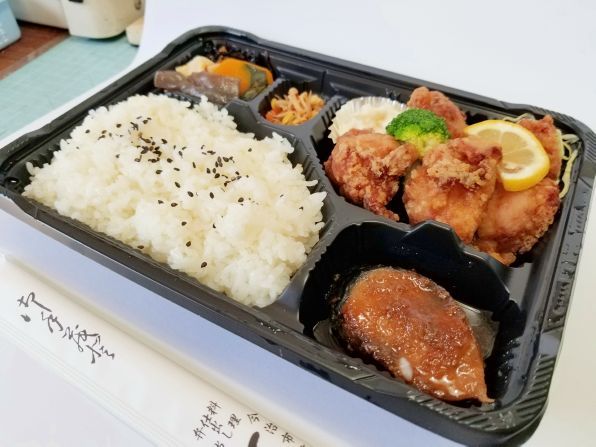 -本日はテイクアウト-『唐揚げ弁当デラックスvr.(一富士)』本日のお昼は、久しぶりに「仕出し弁当 一富士」さんの、新メニュー"唐揚げ弁当(通常400円)"です、、、FBの「いまばりエールクーポン(旧:バリメシテイクアウト)」で見て、気になっていましたねぇ。。。[唐揚げ弁当デラックスvr.:¥500]なので朝の9時半ころでしたが、C内君にメッセージを送ると、用事ついでに届けてくれると返事をくれたので、、、気持ちだけ上乗せして、500円のデラックスvr.でお願いしました。。。そしてお昼前にちゃんと届けてくれました、、、C内君ありがとう~~♪[唐揚げアップで]さぁ気になるお味です。。。1日じっくり仕込みされた唐揚げは、しっかり味がしみていて、塩や醤油は必要ないでしょう、、、ほぅほぅほぅ、弁当なので冷めても美味しい味付けです、、、そんな唐揚げが5個入っていて、もちろん白いご飯に良く合いますねぇ。。。またデラックスvr.なので、「一富士」さんお得意の"鯖煮込"も添えられています、、、ハハハ、これじゃぁご飯が足りません。。。うんうん、旨い旨い~☆[各アップで]*************************************************HP:https://www.facebook.com/ichifuji.chinai/*************************************************