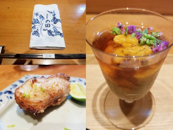 -ソロで行っていないプチ遠征記-『解禁初日に鮎!!(しの田)』今夜は某先輩のお誘いで「しの田」さんです、、、「しの田」さんはミシュラン"☆"のお店なので、庶民の私には高級店ですからねぇ。。。[フグ、ウニ・じゅんさい、ウナギ、ハモ]料理は今回もお任せです、、、フグやウニ・じゅんさいから始まりました。。。それぞれの料理に名前があるかどうかは???ですが、丁寧でセンス溢れる創作料理が出てきます。。。[鮎の塩焼]今日6月1日は鮎漁の解禁日なので、新鮮な鮎も塩焼にしてくれました、、、じっくり焼かれていて、頭から丸ごと骨まで食べられます。。。解禁初日と思うだけで贅沢ですねぇ。。。うんうん、旨い旨い~☆[アコ・アオリイカ、茄子、鯛・破竹、コーンの炊込ご飯、ワラビ餅]またシメはコーンの炊込ご飯だったのですが、コーンの食感が想像していたのと違って、ジャクジャクなのです!! うんうん、こちらも美味しい美味しい~~♪*************************************************【お店の情報】住所:愛媛県今治市松本町2-2-4電話:0898-22-4545営業時間:18:00~24:00定休日:不定休席数:16席駐車台数:2台HP:?*************************************************
