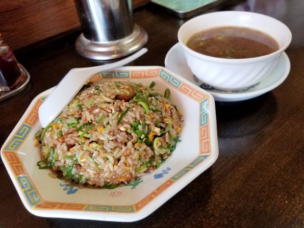 -ソロで行っていないプチ遠征記-『ネギマシの焼き飯(新福菜館)』今日のお昼は、久しぶりに「新福菜館:リンク多いのでたどってください」さんです、、、私の遅いお昼では、いつも暖簾が下がってしまっていたのですが、今日は1時29分のギリギリセーフで滑り込みできましたねぇ。。。[焼き飯:¥550+ネギ:¥100]さてそんな時間ですので、店内にお客さんはいません、、、私は席に着き、今日は"らーめん"でなく、"焼き飯"に"ネギ"トッピングで発注です、、、このネギマシの"ネギ焼き飯(仮称)"が私は大好きなのです。。。 やがて待つこと約4分、、、注文ができあがりました。。。[ネギ焼き飯(仮称)]さぁ気になるお味です。。。テラテラと黒光りした"焼き飯"は、パリっとしっかり焼き込まれ、パラパラの中にも醤油煮汁の芳ばしいさが漂っています、、、その中にシャクシャク爽快な歯ごたえの"九条ネギ"が最高最高っ!! [スープ]"焼き飯"を口内に頬張り、豚骨ベースの濃い醤油味の"スープ"を流し混みます、、、"スープ"は表面に白濁がありますが、基本的には醤油味の清湯スープなので中は濁っていません。。。もちろん"焼き飯"と"スープ"の相性もはバッチリっ!! うんうん、旨い旨い~☆[各アップで]