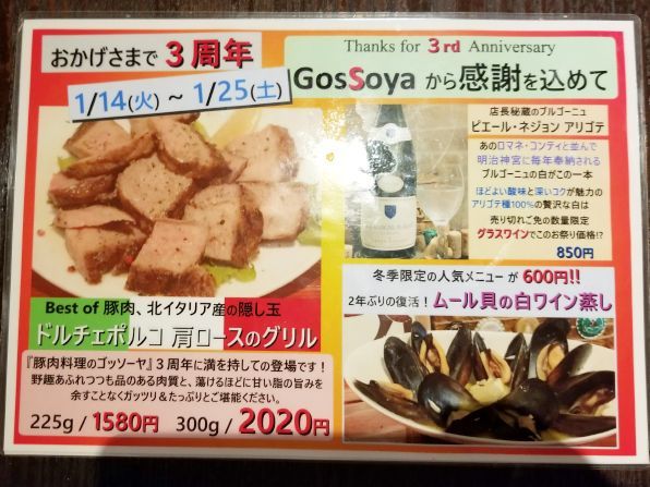 「菊水」さんでの"2020年度今治JCシニアクラブ通常総会・1月新年例会"の後、まさかのIK君が、"ボクがオゴルので、ワインを飲みにいきましょう~~っ!!" と言うので、ローズSPと三人で「ワイン食堂 gosSoya(ゴッソーヤ): リンク多いのでたどってください 」さんにやって来ました、、、これは天変地異の前触れか!? それでもOK、OK、、、喜んでオゴられましょうゾ、オゴられましょうゾ。。。(^_-)b