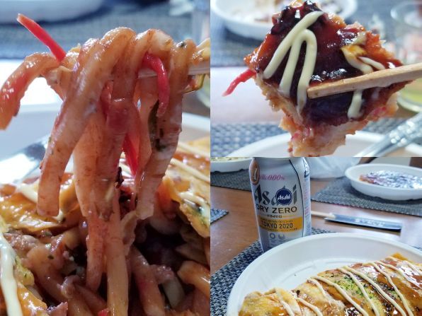 という事で自宅に帰り、ノンアルコールビールを添えて、気になるお味(オムうどん)です。。。名前のとおり"オムそば"のうどんバージョンで、焼きうどんが卵でくるまれています、、、そばの中華麺と比べると、うどんなのでややサッパリとしています。。。