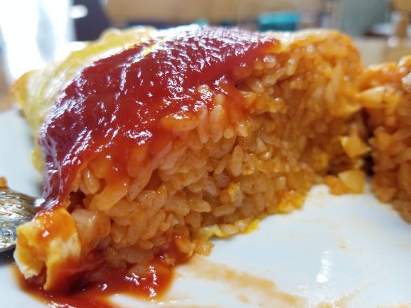 暖簾をくぐったのは午後1時20分ころ、、、店内にはお客さんが二人です。。。先日、店主さんにお会いしたとき、、、やはり新型コロナの影響で苦戦していると言われていました。。。私は空いていた席に着き"オムライス"を発注、、、ややがて待つこと約5分でできあがりです。。。