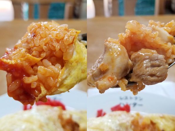 さぁ気になるお味です。。。。ゴロゴロの鶏モモ肉が入ったケチャップタップリのチキンライスを、黄色い薄焼卵がクルンと包装、、、その上には食堂系らしく真っ赤なケチャップで、チキンライスと合わせてWケチャです!! そして何と言ってもボリューム満点な"オムライス"ですねぇ。。。うんうん、旨い旨い~☆