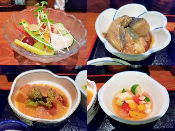 そしてそれ以外がまたスゴイっ!! "茄子の煮浸し"も立派なご飯のおかずですし、"ブロッコリーのイタリアンっぽいの"、"野菜の酢漬けっぽいの"、"ピリ辛の冷や奴"、"漬物4種"、"揚げ・豆腐・エノキの味噌汁"、"ブドウ・梨の入ったサラダ"です、、、これでお値段680円は、採算度外視の大盤振る舞いっ!! うんうん、旨い旨い~☆
