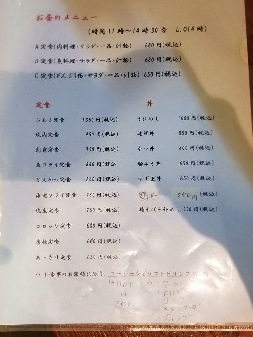 午後1時15分頃に暖簾をくぐると、座敷席は?ですが、カウンター席にお客さんはいませんでした、、、私は一人なのでカウンター席につき、今日の定食を拝見。。。おっ!? "A定食(肉料理)"が"とんかつ"のようです、、、なのでそちらをお願いしました。。。